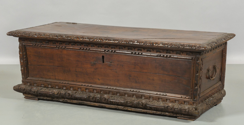 Piccola cassapanca in noce, bordi del coperchio e cornici intagliate, Liguria sec.XVIII