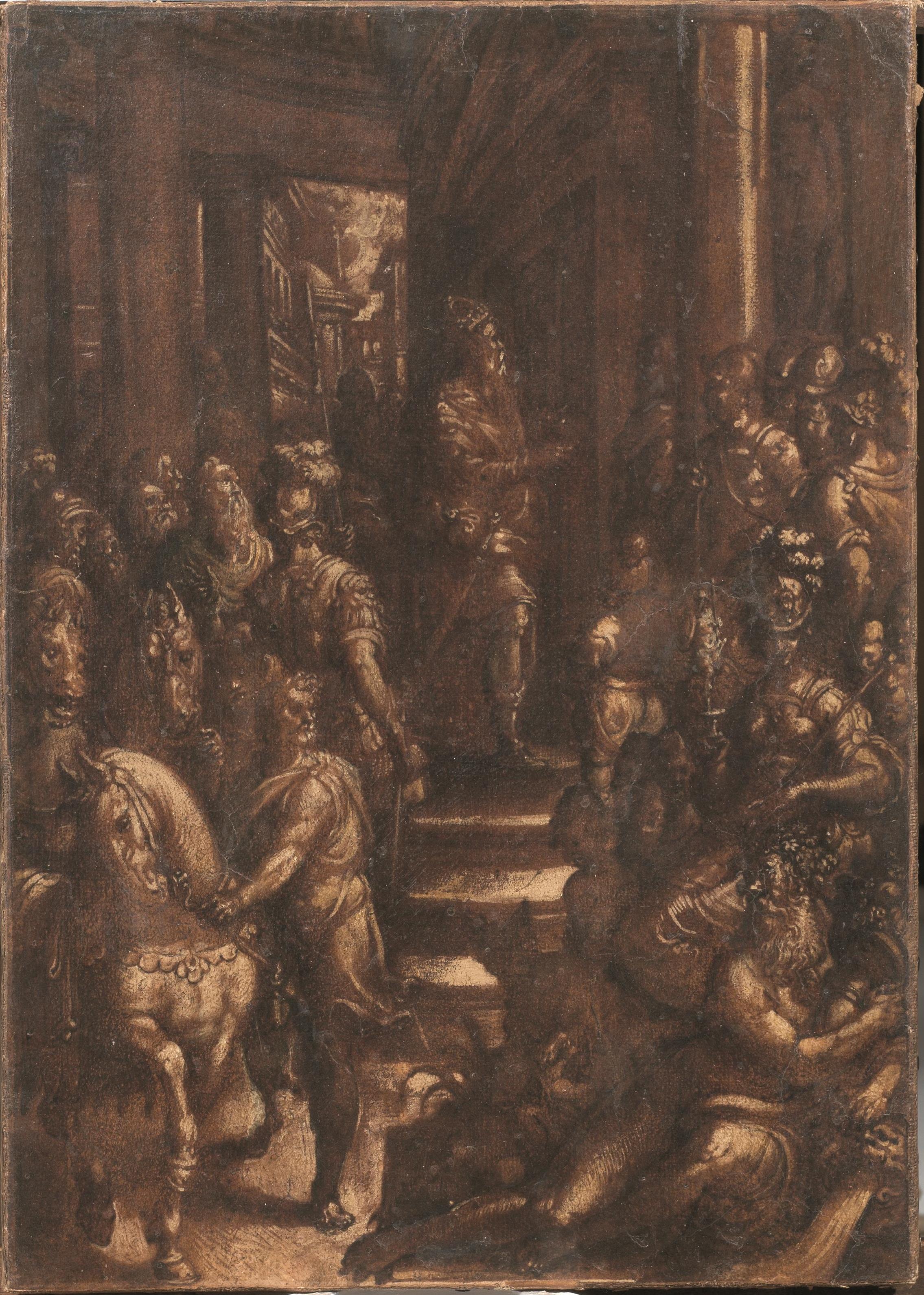 Foglio di alta qualità grafica e matura esecuzione pittorica, certamente collocabile nell’alto manierismo toscano; non vi sono evidenze dirette che ne possano certificare l’autografia allo Stradano; tuttavia, la figura della divinità tutelare di Roma alla destra dell’articolata composizione, è da porre in stretta relazione con quella del celebre disegno del British Museum L’allegoria delle arti (Inv. 5214-2. Turner, 144), poi tradotto in incisione nel 1578 da Cornelis Cort (TIB 52 Supp, 218).