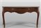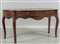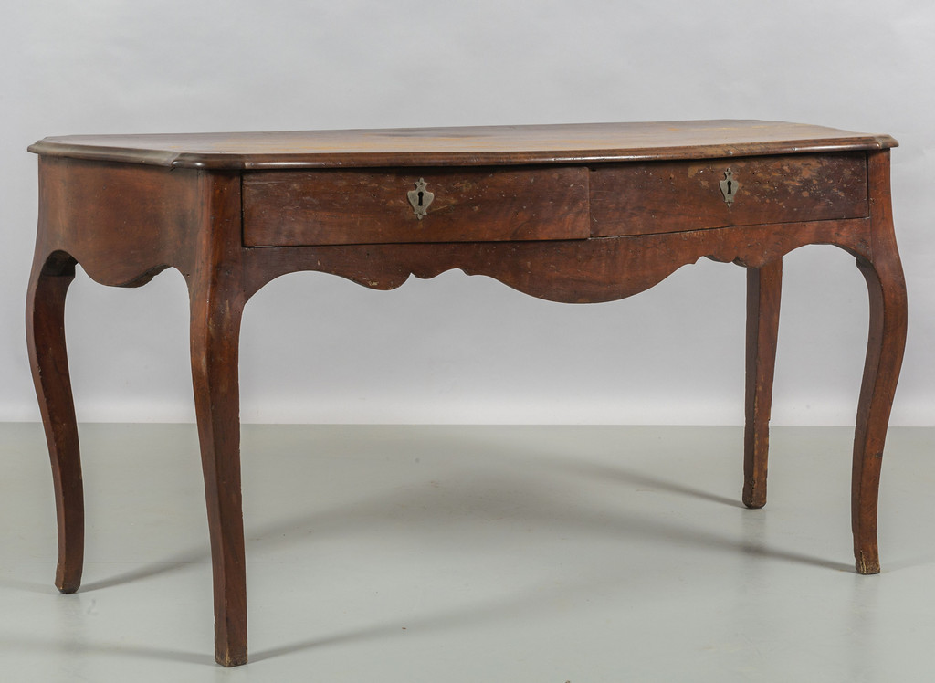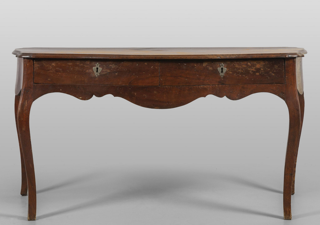Console Luigi XIV in noce movimentata sul fronte sui fianchi, due cassetti nella fascia, piano sagomato, Genova metà sec.XVIII