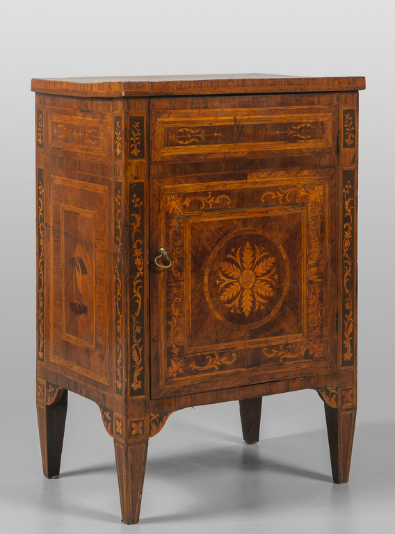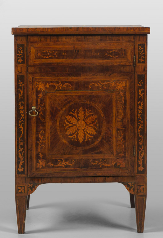 Comodino a uno sportello lastronato ed intarsiato in legni vari, Lombardia II metà sec.XVIII