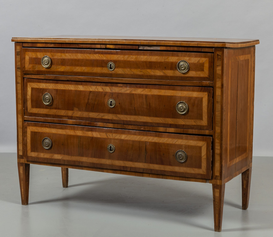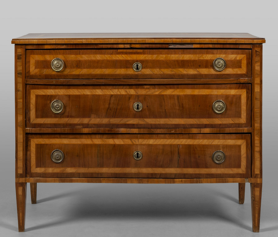 Comò Luigi XVI lastronato in noce e filettato in ulivo, tre cassetti sul fronte, piano lastronato, Genova II metà sec.XVIII
