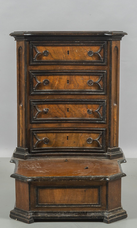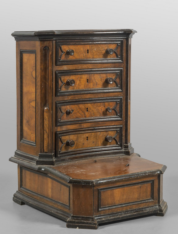 Inginocchiatoio Luigi XIV a quattro cassetti, lastronato in radica di noce con profili ebanizzati, Lombardia sec.XVIII