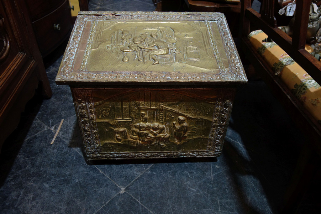 # Portalegna in lamierino sbalzato con scene di interni, Inghilterra sec.XIX