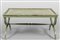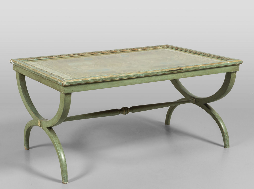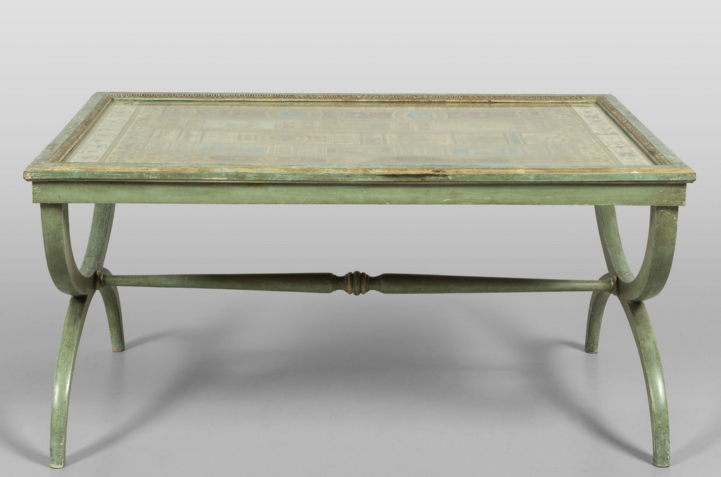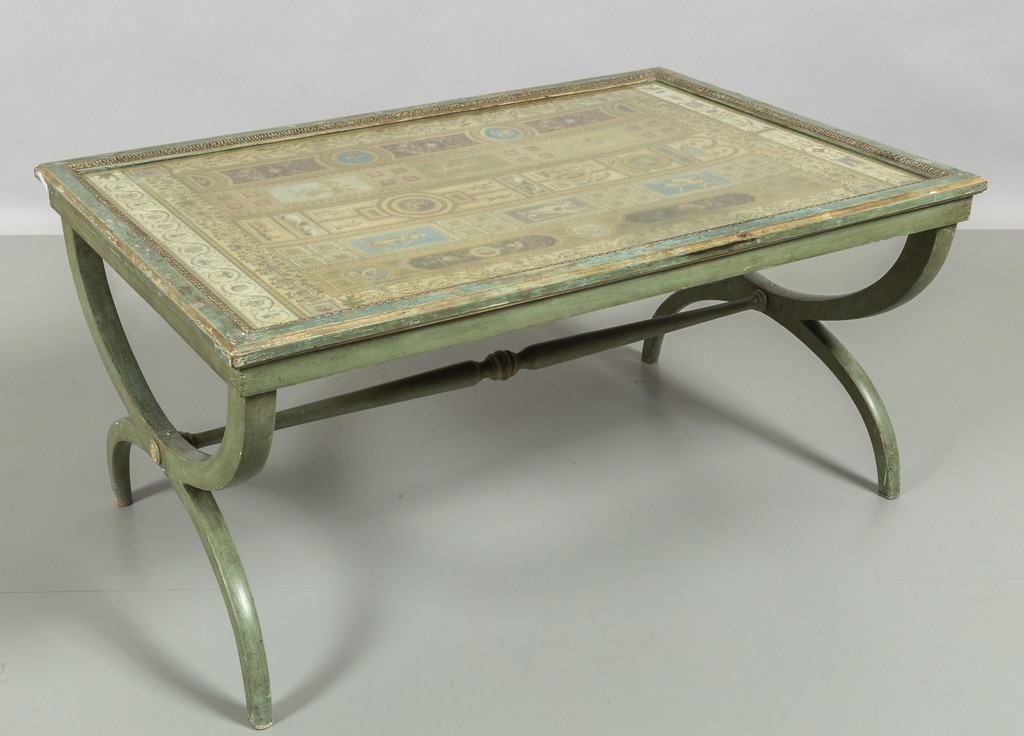 Tavolino da divano in legno finemente intagliato, laccato e dorato, piano composto da antica gouache, sec.XIX