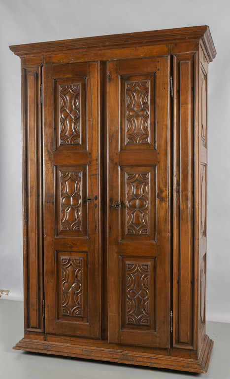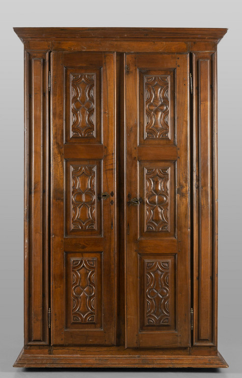Armadio Luigi XV in noce a due sportelli scolpiti a formelle, Piemonte I metà sec.XVIII