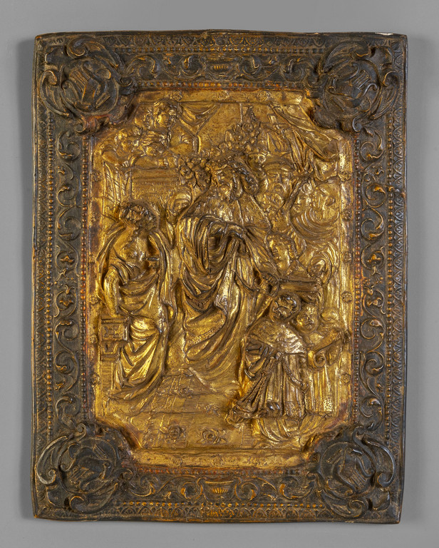 Placca in legno intagliato e dorato raffigurante