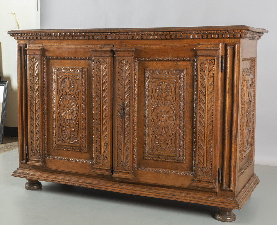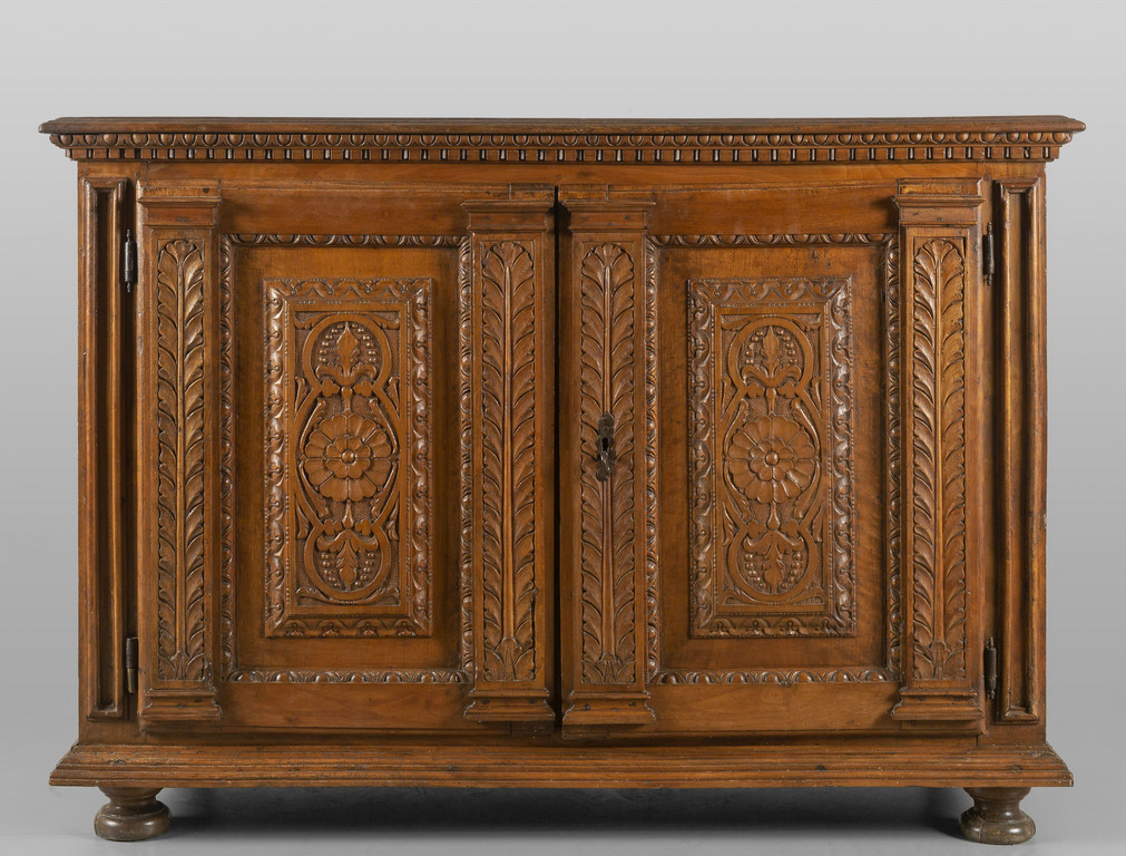 Credenza a due sportelli in noce con montanti scolpiti a motivo di lesene, Piemonte sec.XVIII
