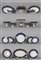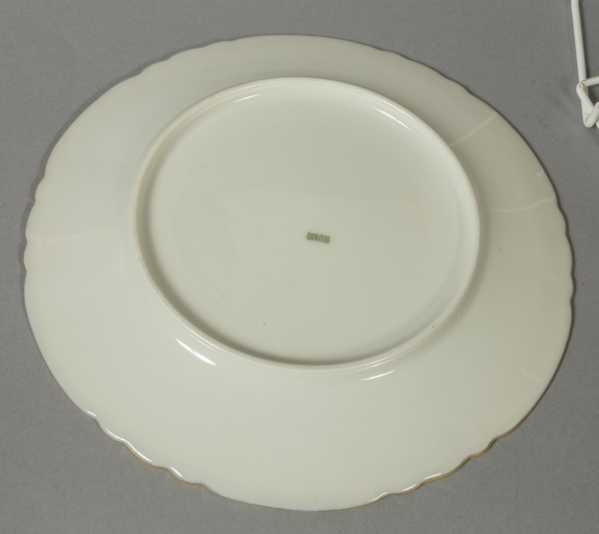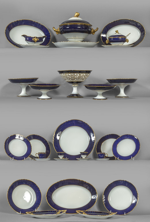 Servizio di piatti in porcellana Ginori bianca e blu con profili dorati, prese con teste di arieti dorate, sec.XIX, composto da 45 piatti piani, 20 frutta, 12 fondi, 1 zuppiera con sottopiatto, 2 salsiere (1 con coperchio), 2+2 alzate, 6 raviere, 1 alzata portafrutta, 4 piatti da portata ovali, coppia di piatti da portata rotondi, 11 portauovo, 6 tazzine da caffè simili con piattini