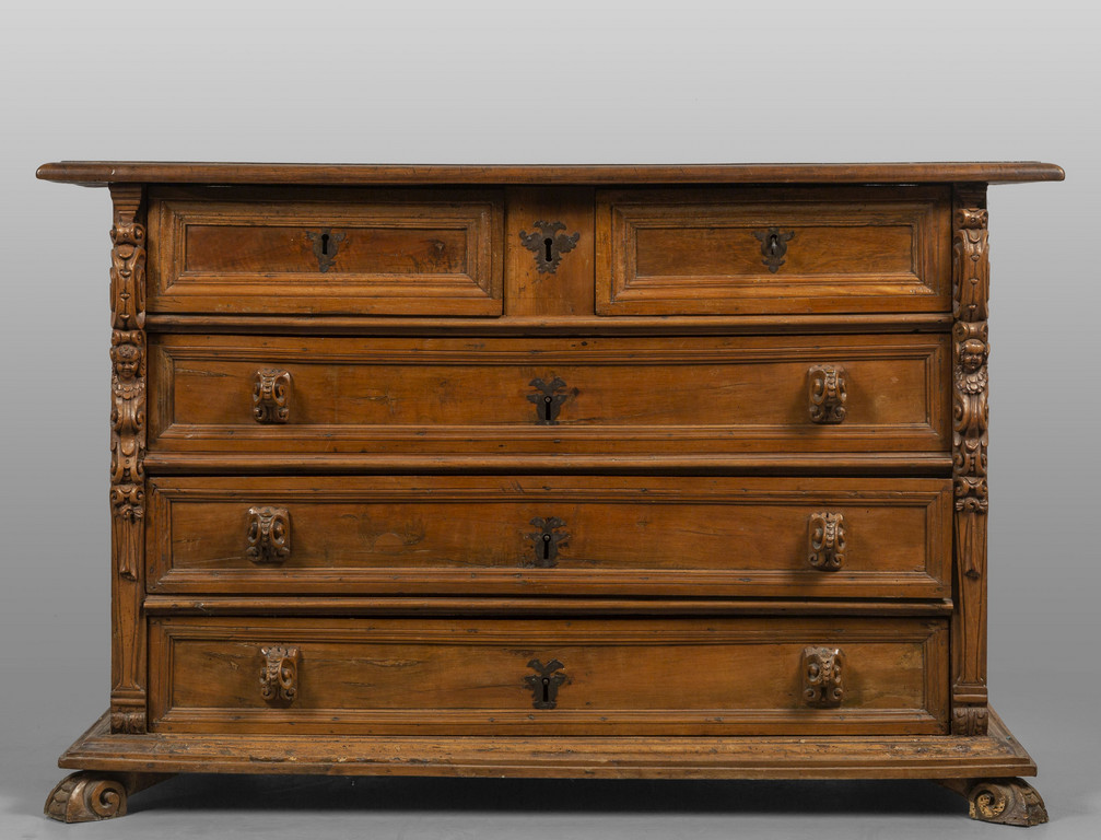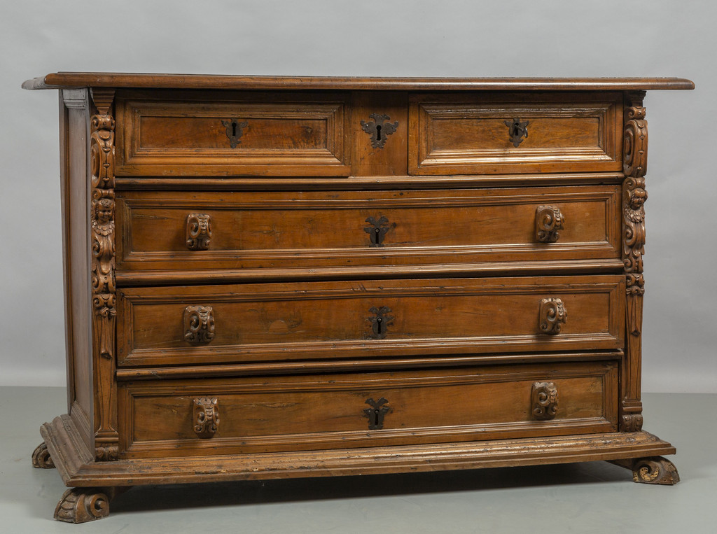Canterano Luigi XIII a tre cassetti più due in noce, montanti intagliati, Genova II metà sec.XVII