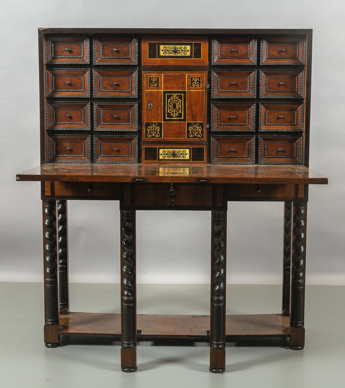 Monetiere Luigi XIV lastronato in palissandro ed ebano, all'interno diciotto cassettini e sportello a tabernacolo, Germania sec.XVIII