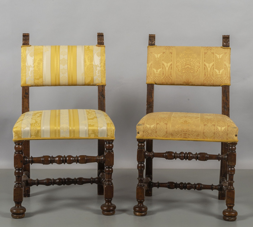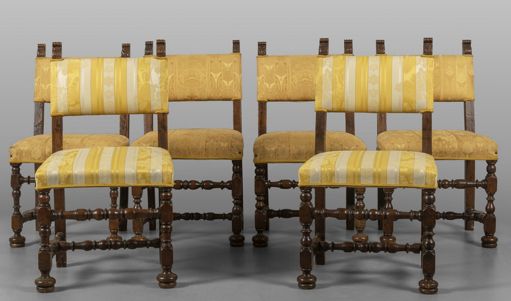 Sei sedie a rocchetto in noce ricoperte in stoffa gialla, inizi sec.XVIII