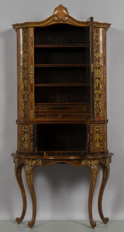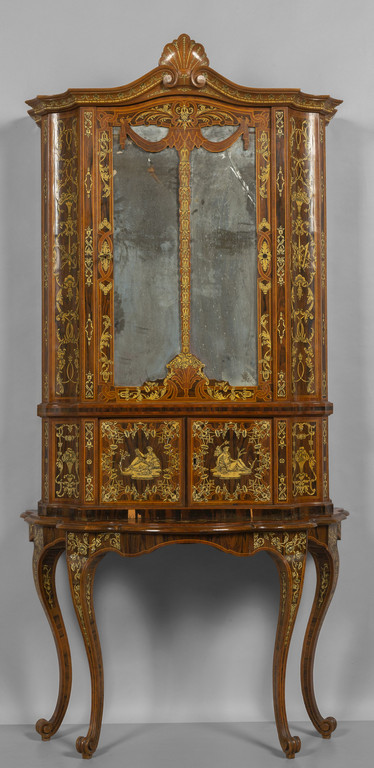 Console con alzata riccamente intarsiata in legni esotici ed avorio nel gusto dell'ebanista piemontese Pietro Pifetti, inizi sec.XX