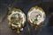 Coppia di piatti inglesi in terraglia raffiguranti paesaggi, montati in ottone ad aplique con due braccetti