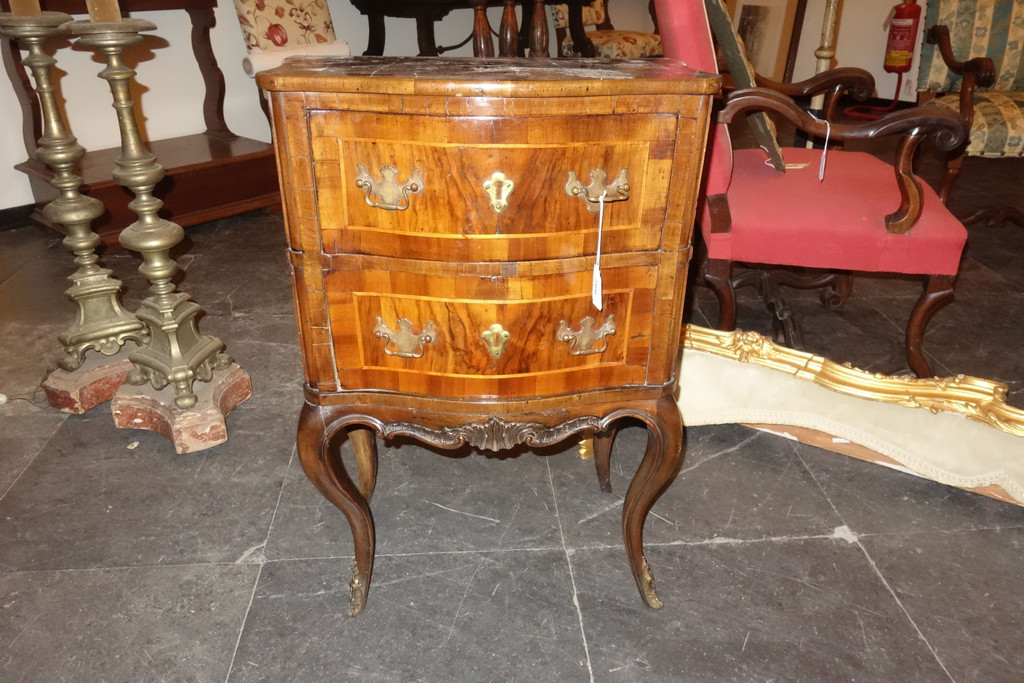# Comodino Luigi XIV movimentato sul fronte e sui fianchi, due cassetti, lastronato in radica e filettato in bois de rose, Veneto sec.XVIII