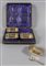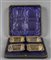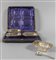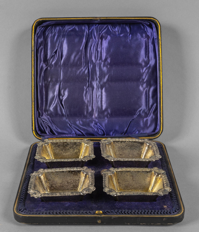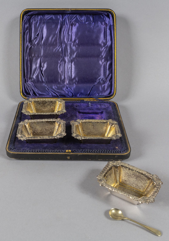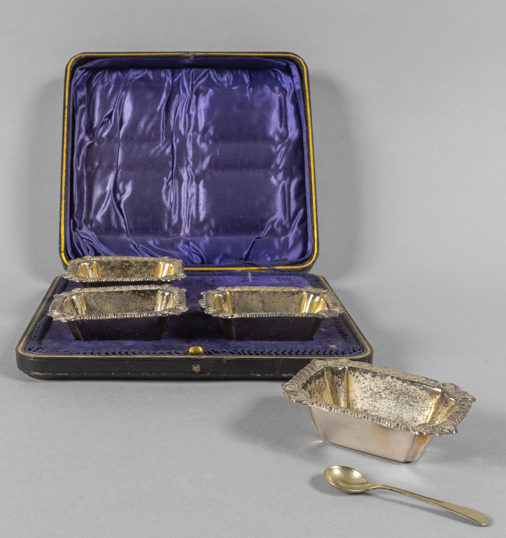 Quattro saliere in argento con cucchiaini nella loro scatola originale, Inghilterra sec.XIX