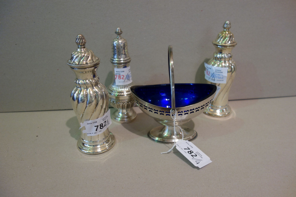 # Sale e pepe in argento, spargizucchero in argento e cestino con vetro blu