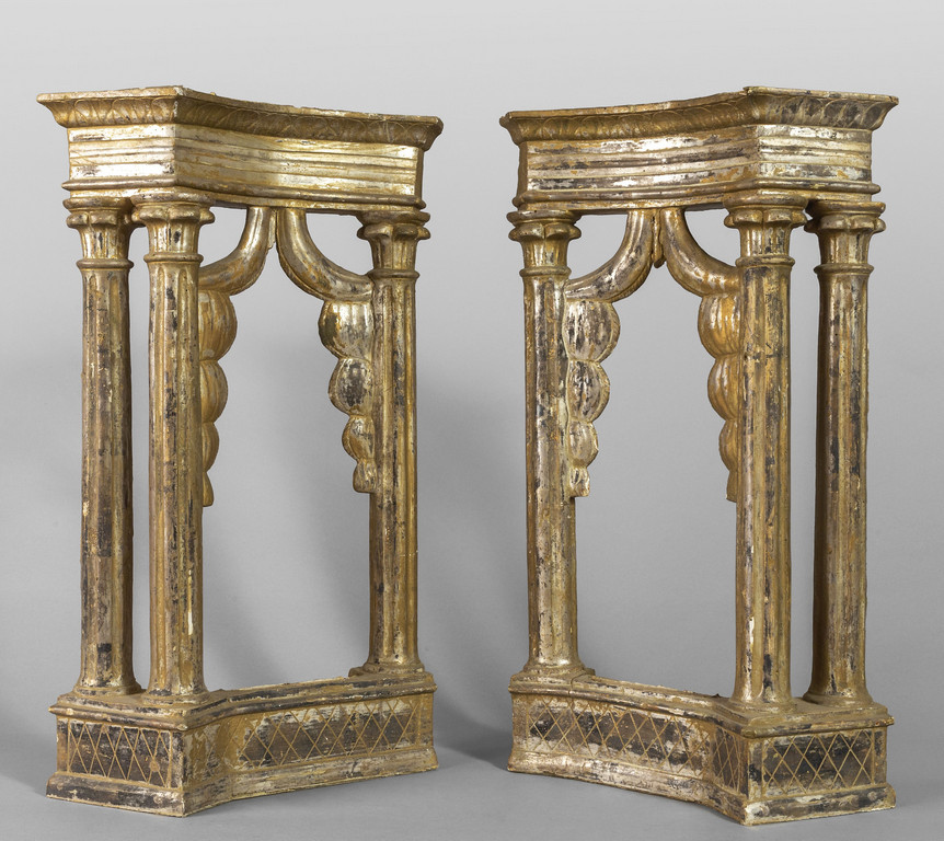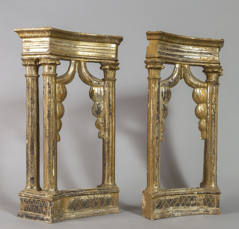 Coppia di elelmenti architettonici in legno intagliato e dorato a mecca, sec.XVIII