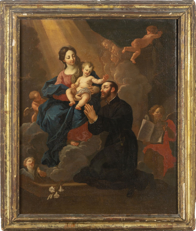 Scuola veneta sec.XVIII "Madonna con Bambino ed il Beato Zaccaria" olio, cornice coeva in legno intagliato e dorato