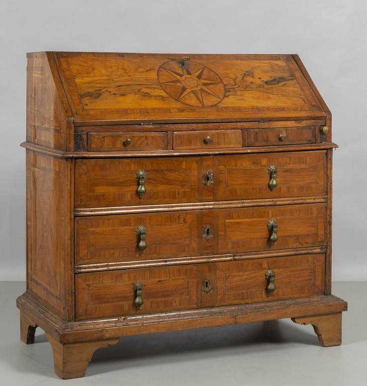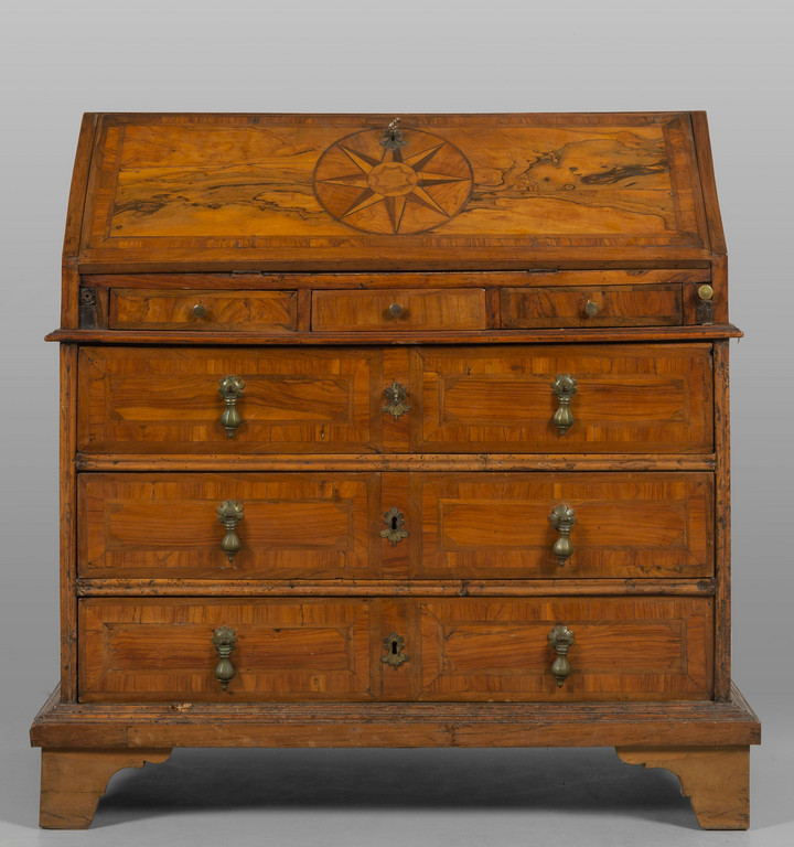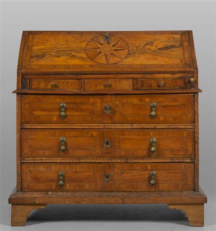 Bureau Luigi XIV lastronato in ulivo con rosa dei venti al centro della ribalta, sul fronte tre cassetti grandi e tre piccoli, Genova II sec.XVIII