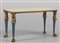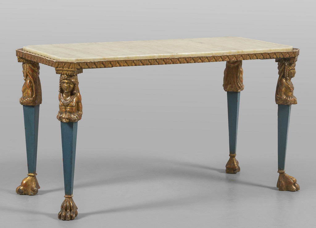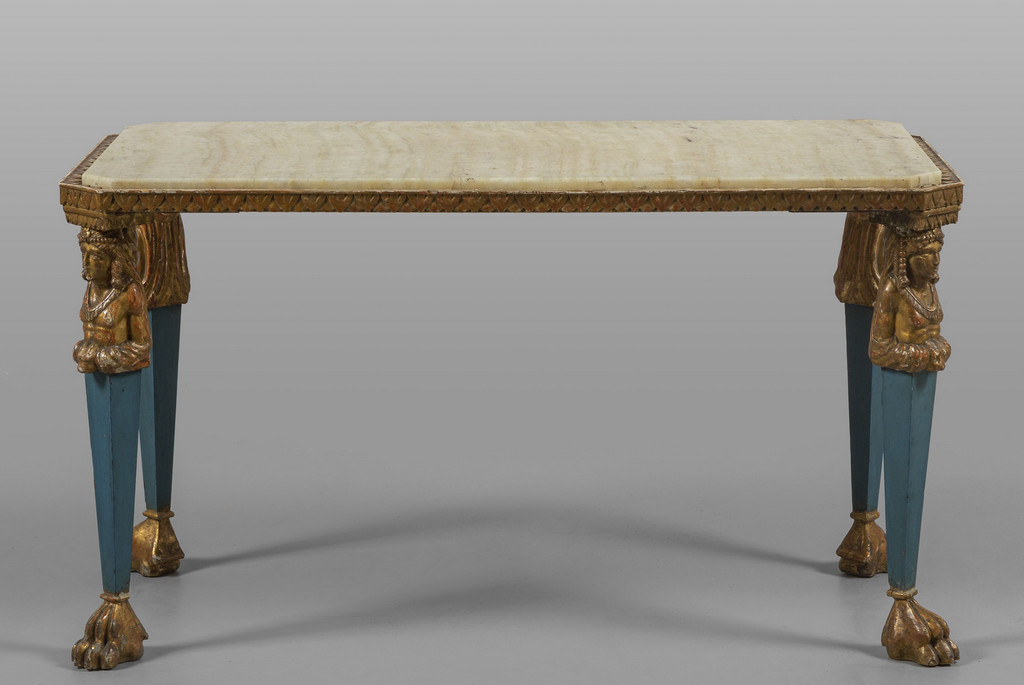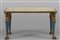 Tavolino da sofà in legno dorato e laccato, piano sorretto da quattro gambe con sfingi