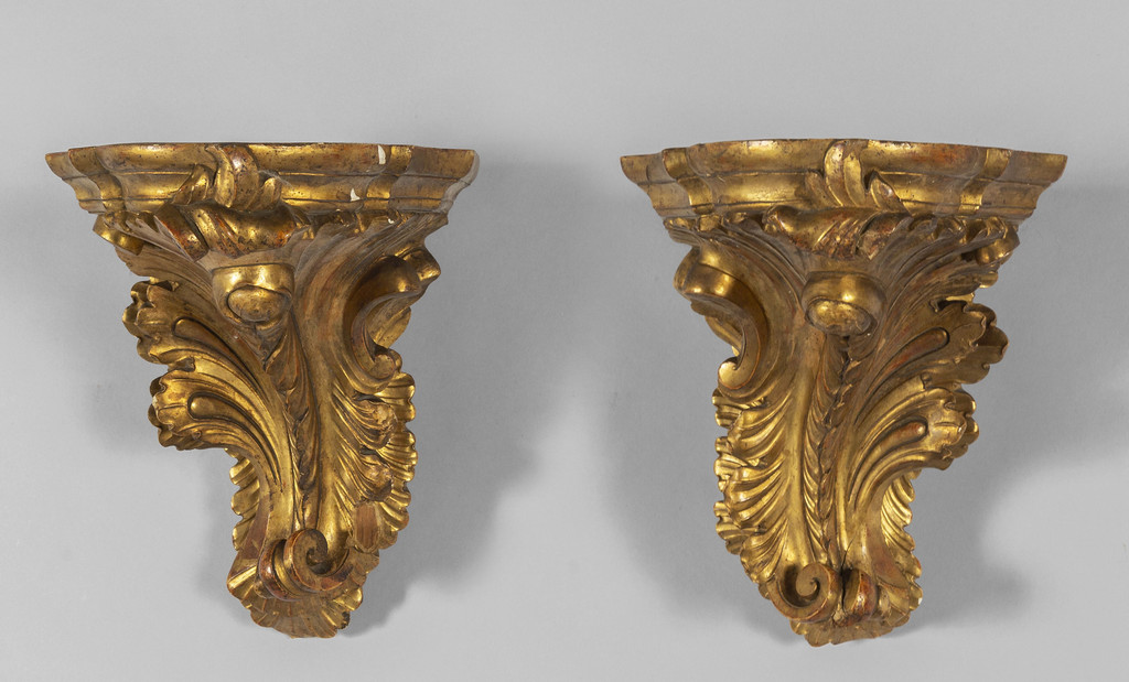 Coppia di mensole ad angolo in legno finemente intagliato e dorato, sec.XIX