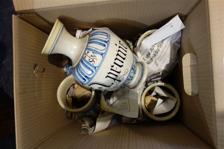 Due albarelli, albarello piccolo, una bottiglia e un versatoio in maiolica, Pavia sec.XVIII (difetti e restauri)