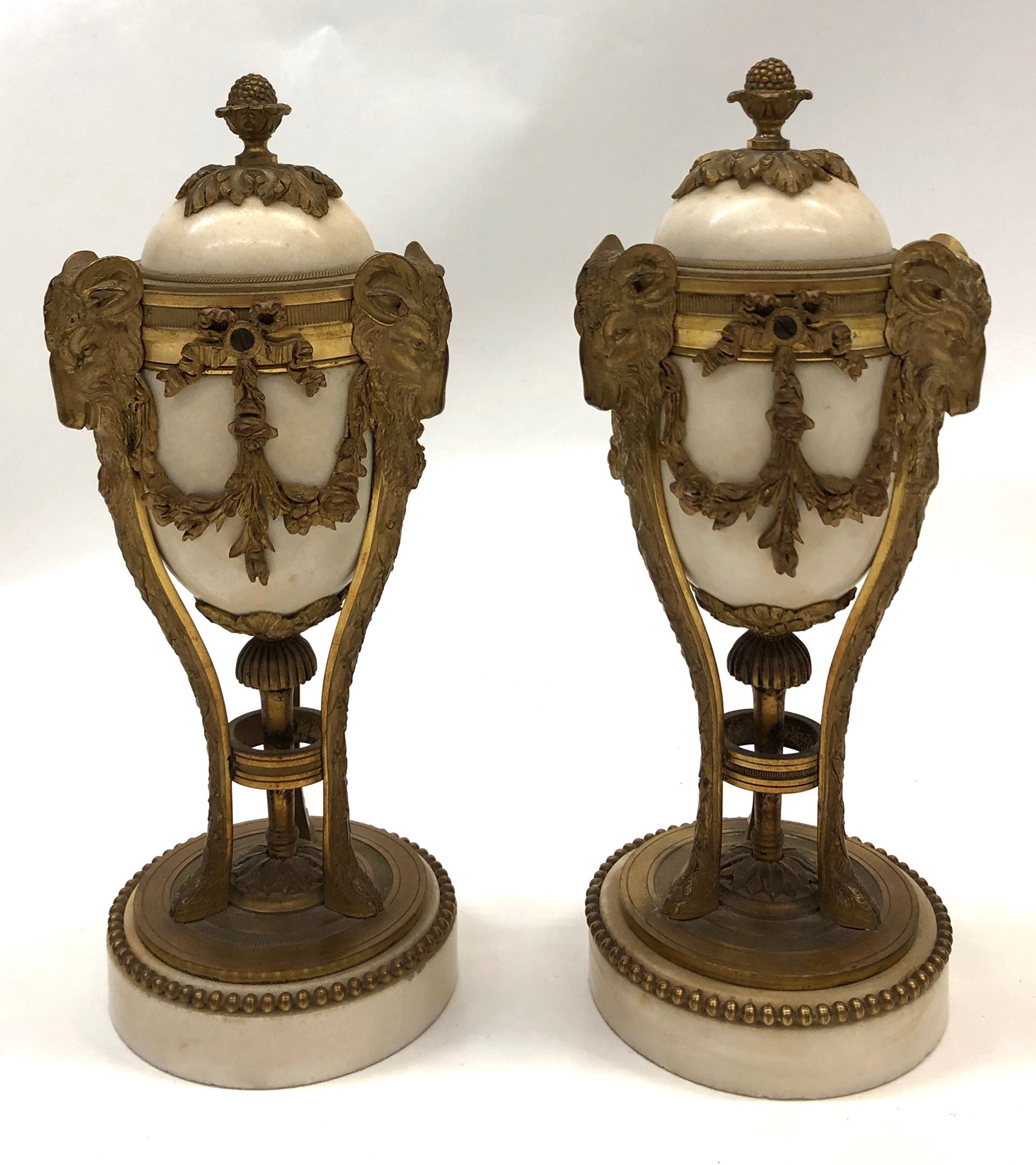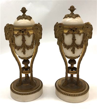 coppia di cassolet in marmo bianco e bronzo dorato, Francia inizio sec.XIX