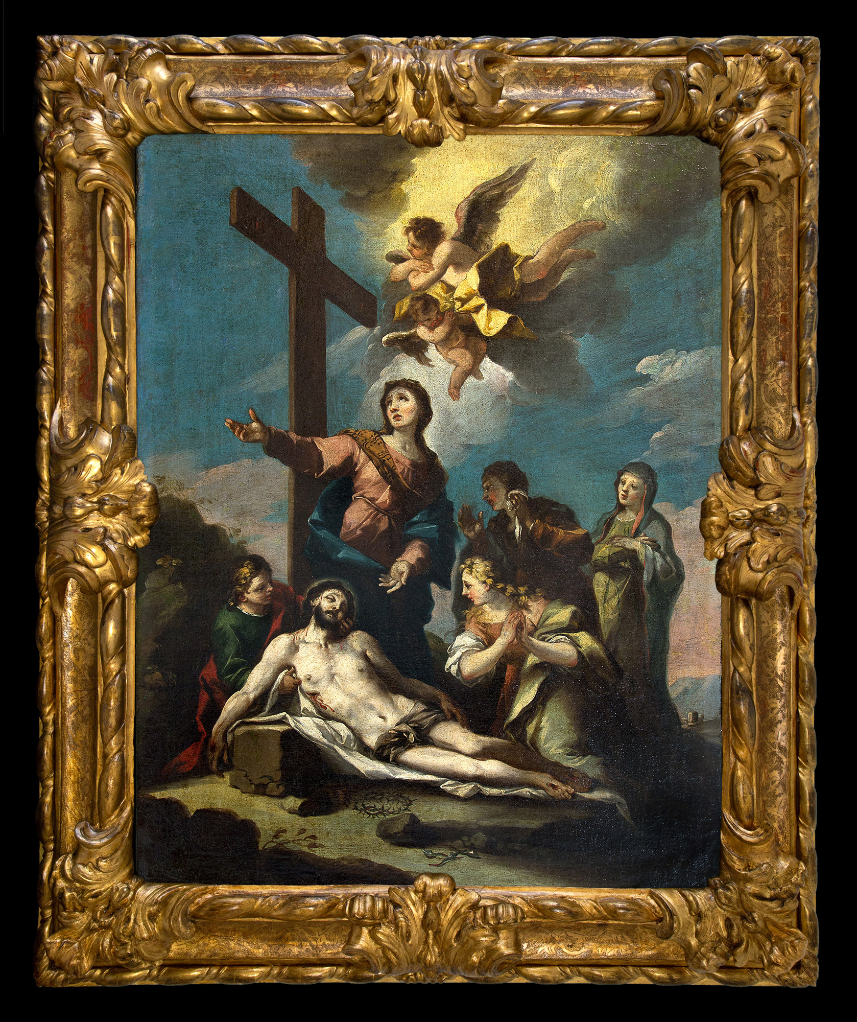 olio su tela in antica cornice scolpita e dorata raff.deposizione di Cristo,