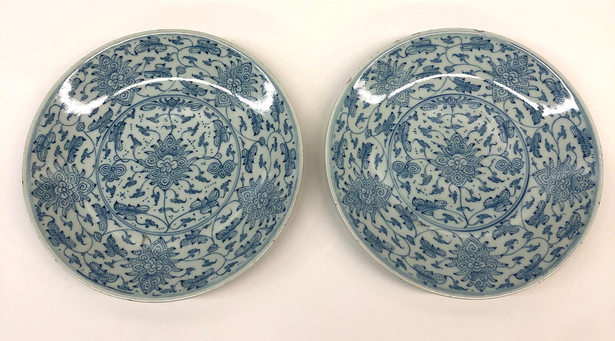 Cina coppia di piatti bianchi e blu decorati con motivi floreali