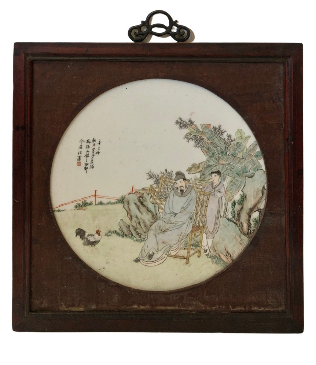 Cina placca in porcellana dipinta entro cornice in legno (misure con cornice)