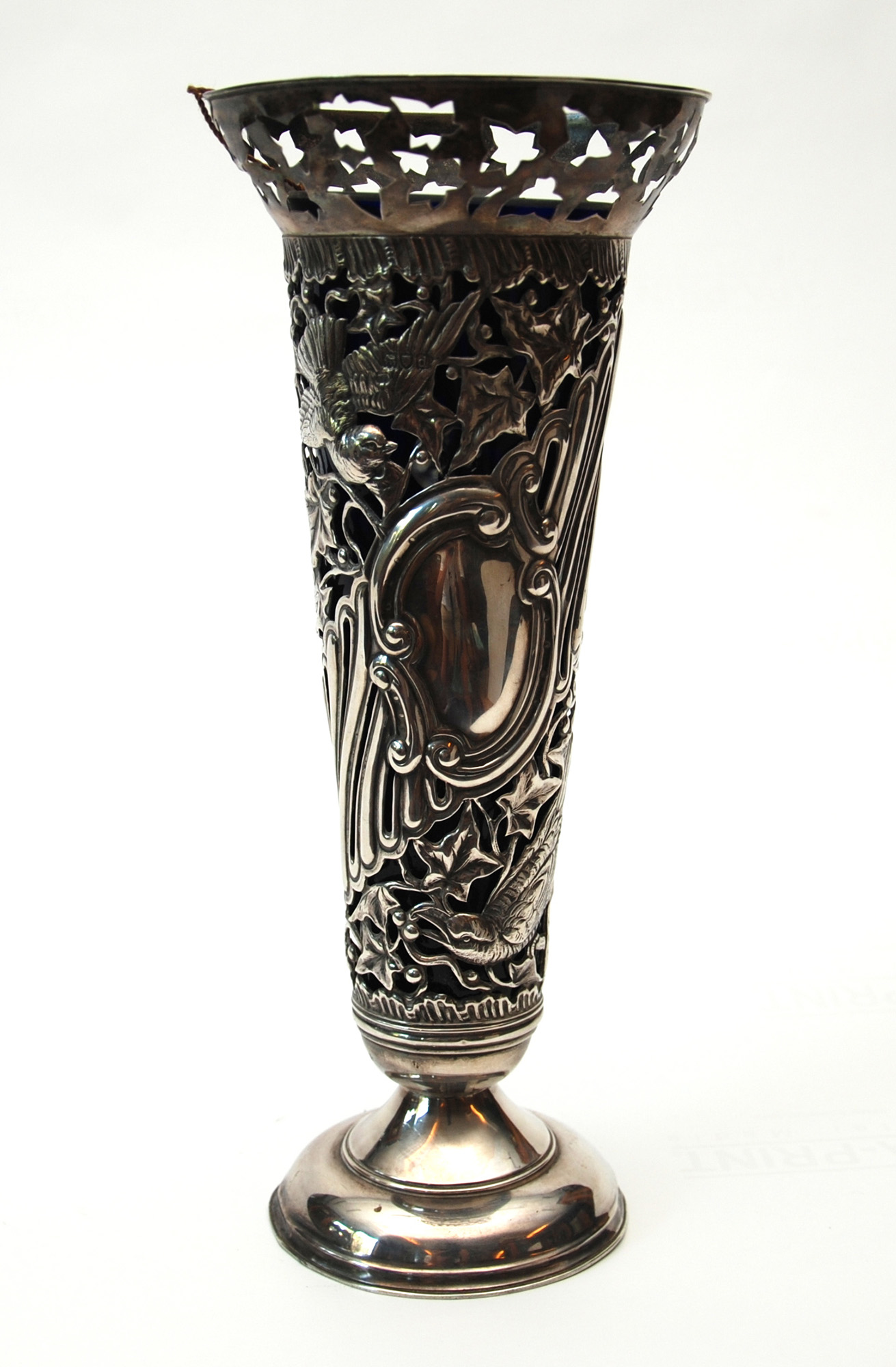 vaso in argento traforato decoro vegetale con volatili Londra 1899