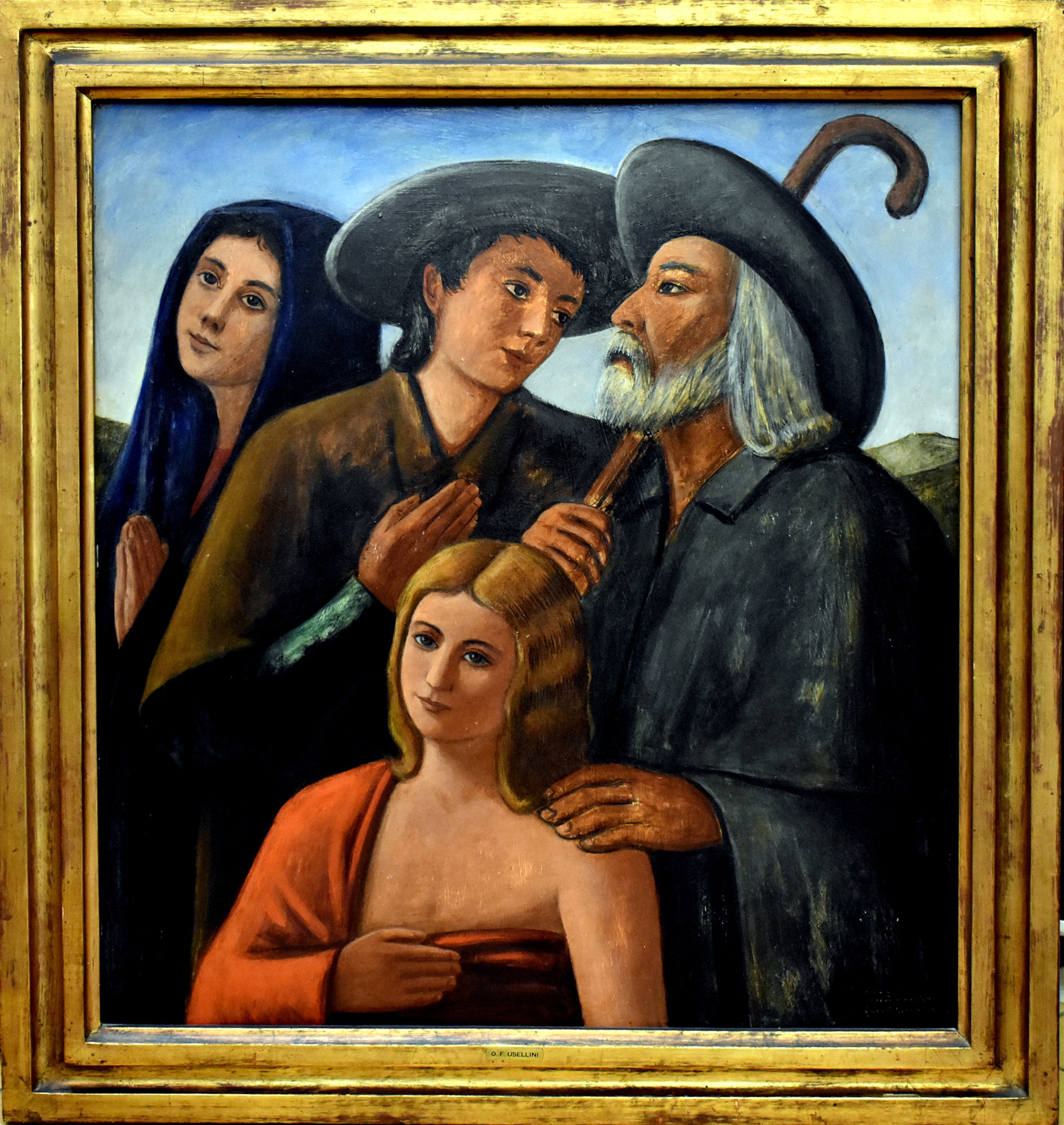 Gianfilippo Usellini 1903/1971 "i pellegrini" olio su compensato anni 30, firmato in basso a destra, databile 1933 perchè commissionato al pittore direttamente dalla famiglia dei proprietari in occasione di un erede del giugno 33