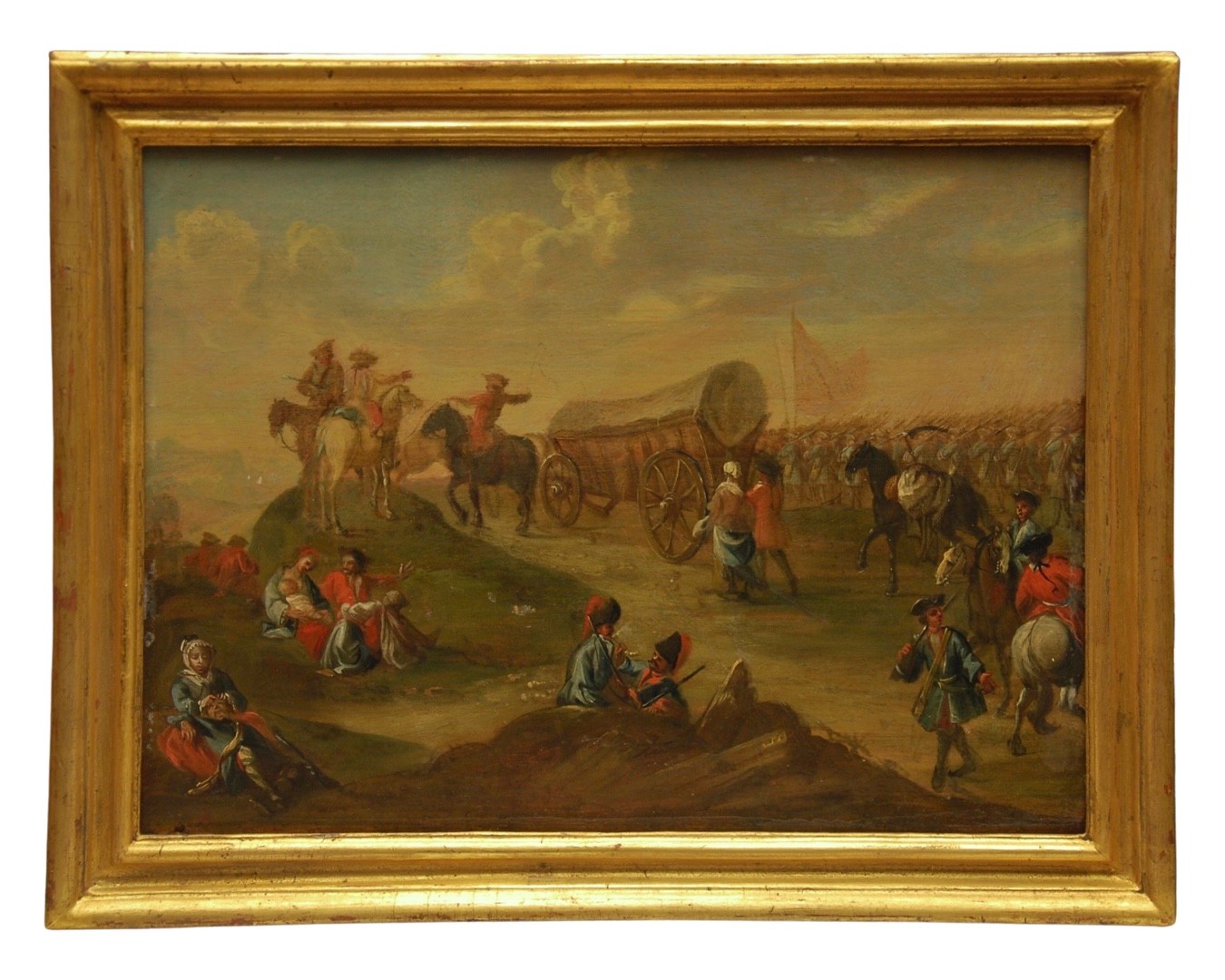 Scuola fiamminga, olio su tavoletta raff. accampamento con soldati, sec.XVII
