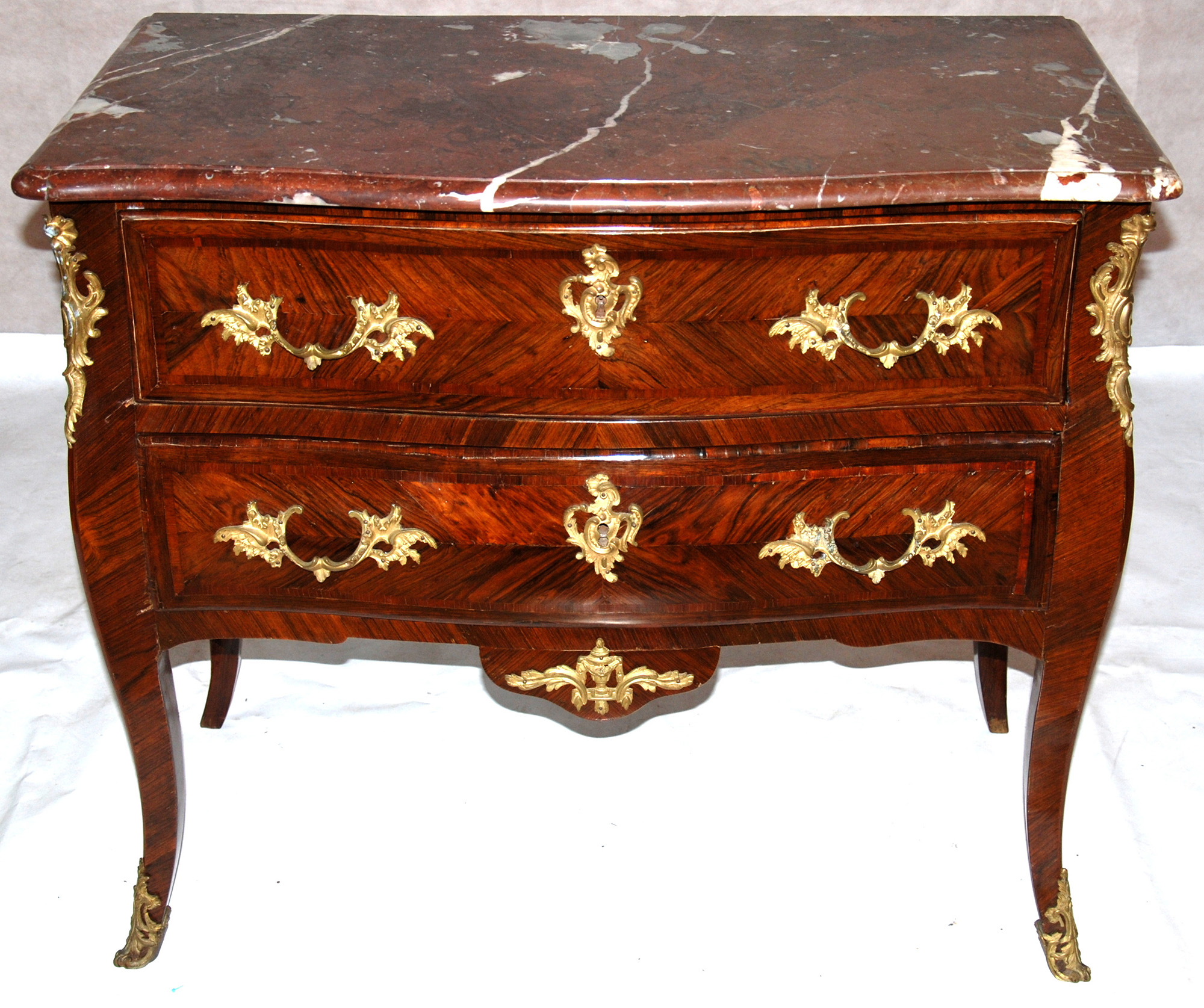 piccolo cassettone epoca Luigi XV in palissandro a due cassetti, guarniture in bronzo dorato mosso sul fronte e sui fianchi sec.XVIII