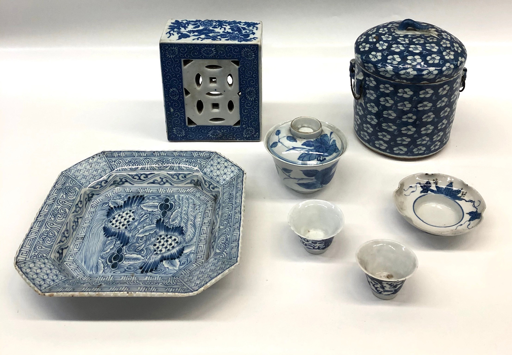 Cina lotto n.7 oggetti vari in porcellana bianca e blu