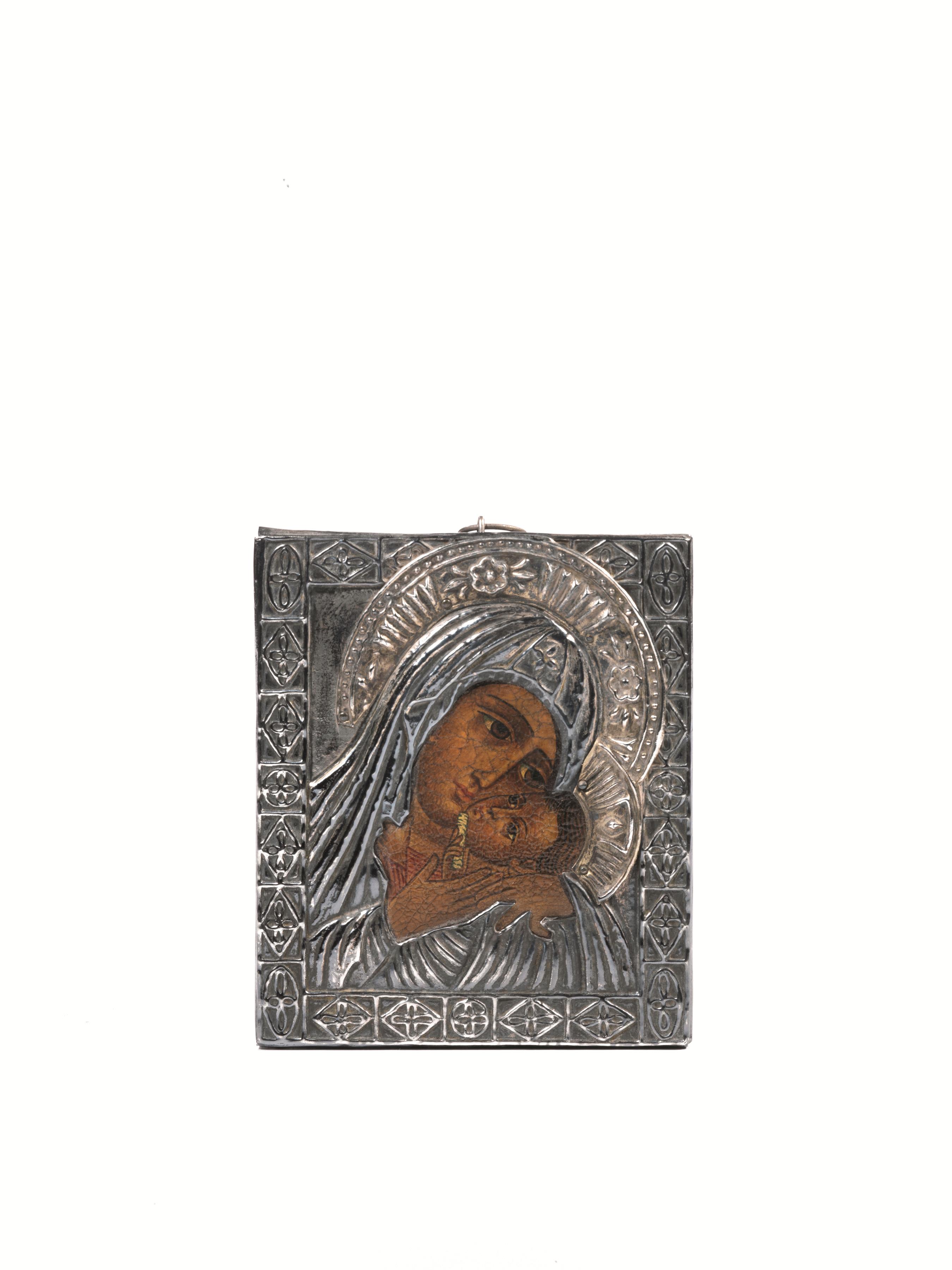 Icona raffigurante Madonna con Bambino, riza in argento, cm 10x9