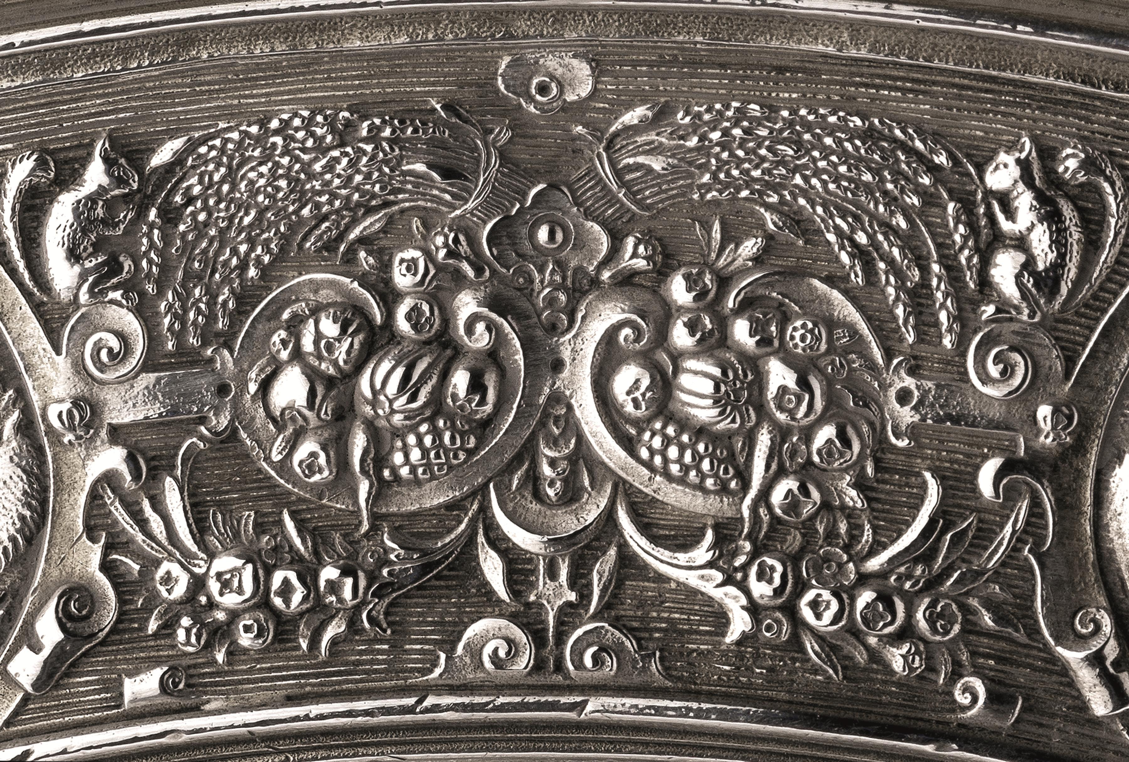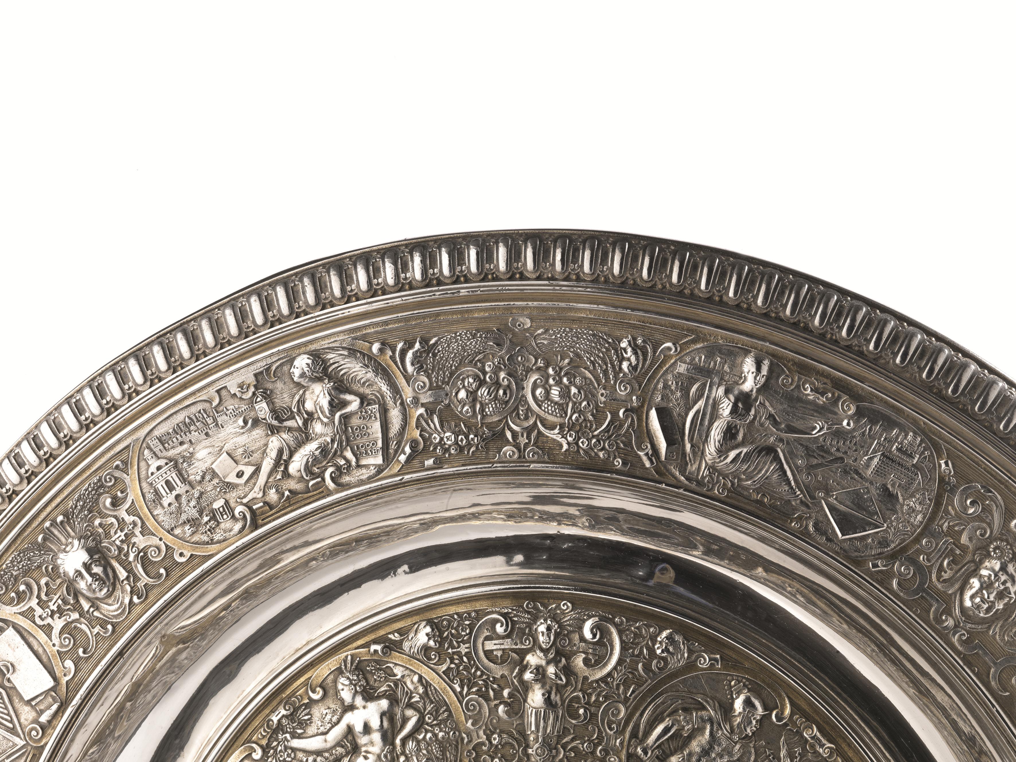 Grande piatto da parata, Birmingham, sec. XX, in argento riccamente sbalzato a grottesche e figure allegoriche, diam. cm 47, g 2020