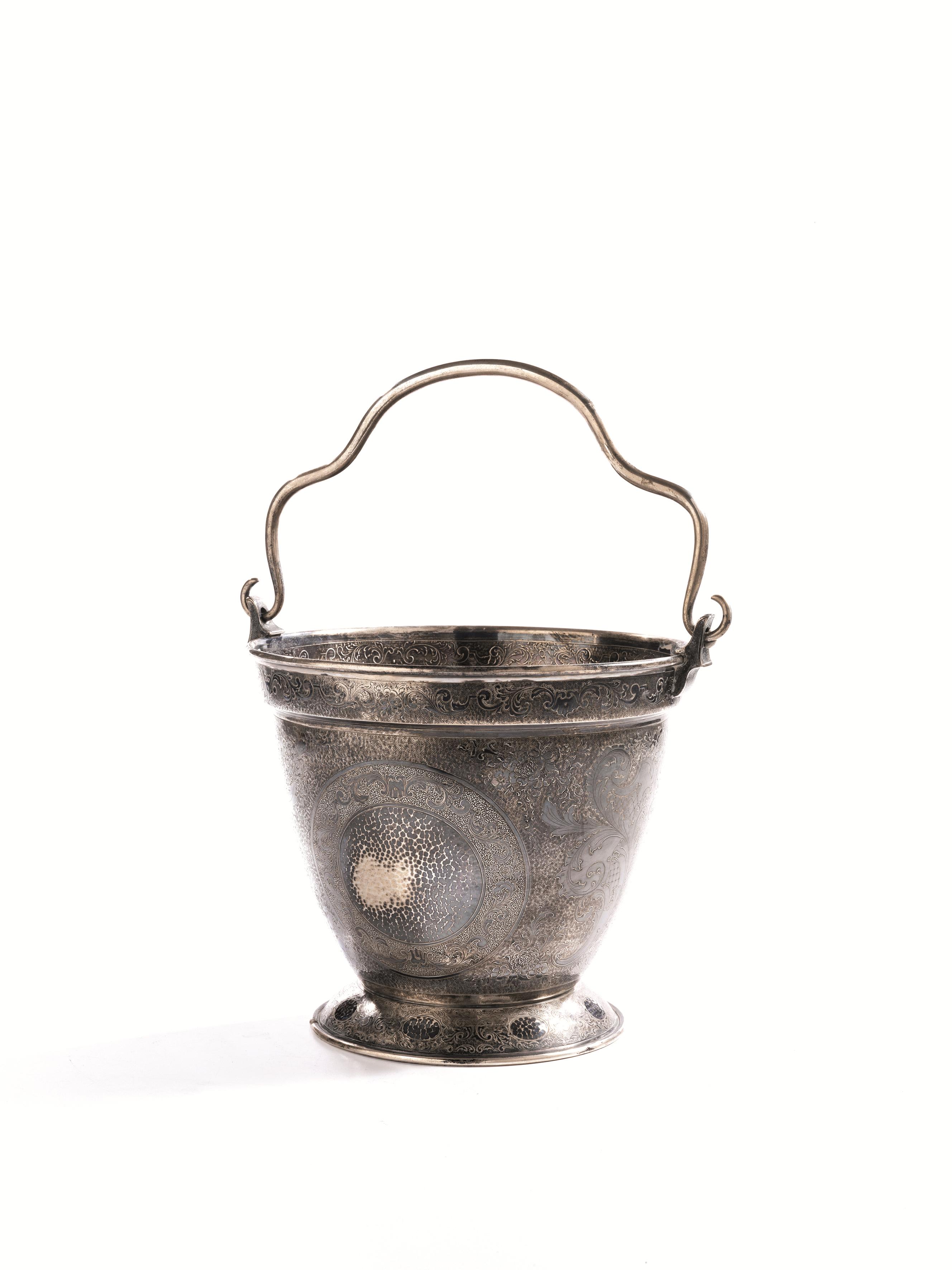 Secchiello, in argento, corpo inciso con girali e volute, alt. cm 21,5, g 1275