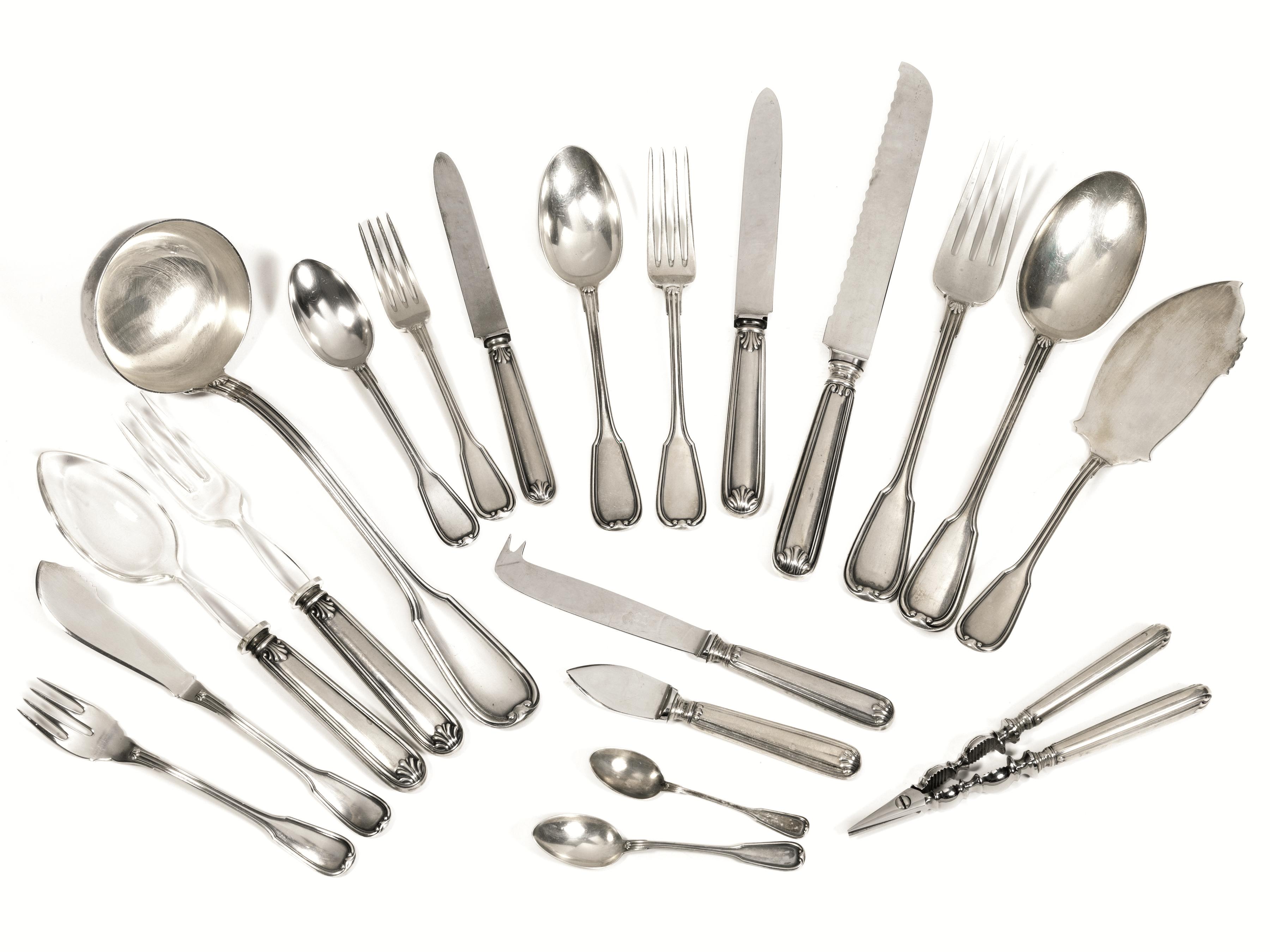 Servito di posate, in argento, manici cesellati a palmette, composto di centotrentuno pezzi, complessivi g 6100 netti (131)