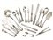 12 forchette, 12 coltelli, 12 cucchiai, 12 forchette da pesce, 12 coltelli da pesce, 12 cucchiai da dessert, 12 forchette da frutta, 12 coltelli da frutta, 13 cucchiai da tè, 12 cucchiani da moka, 2 posate da insalata, 1 ramaiolo, 1 coltello da pane, 1 paletta e 1 forchettone da dolce, 1 coltello da formaggio, 1 coltello da parmigiano, 1 schiaccianoci