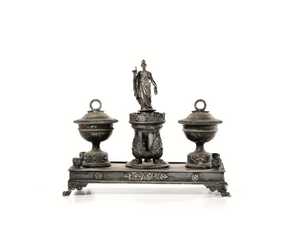 Calamaio, Milano, sec. XIX, in argento, base rettangolare su piedi a zampa ferina, due vani portapolvere configurati a vaso con coperchio che fiancheggiano la statua della dea Atena su piedistallo, alt. cm 21, lung. cm 24