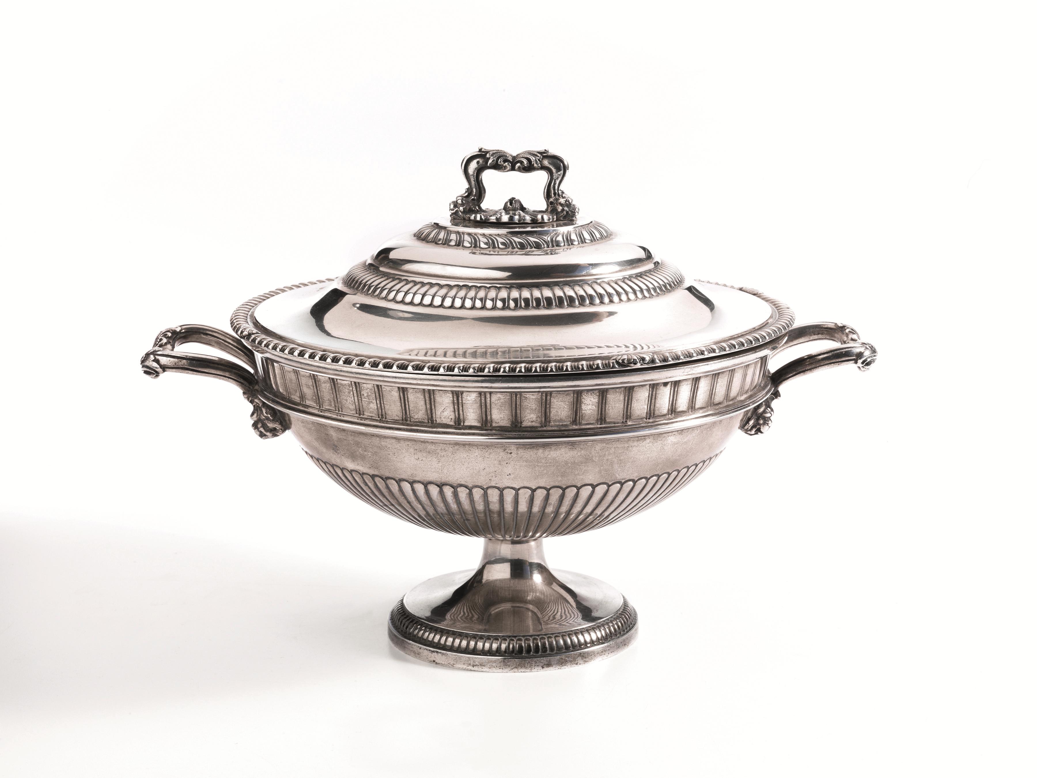 Zuppiera, sec. XX, in argento, di forma cicolare, corpo sbalzato a baccellature, due anse unite al corpo da teste ferine, coperchio con presa a volute contrapposte, diam. cm 24, g 1945