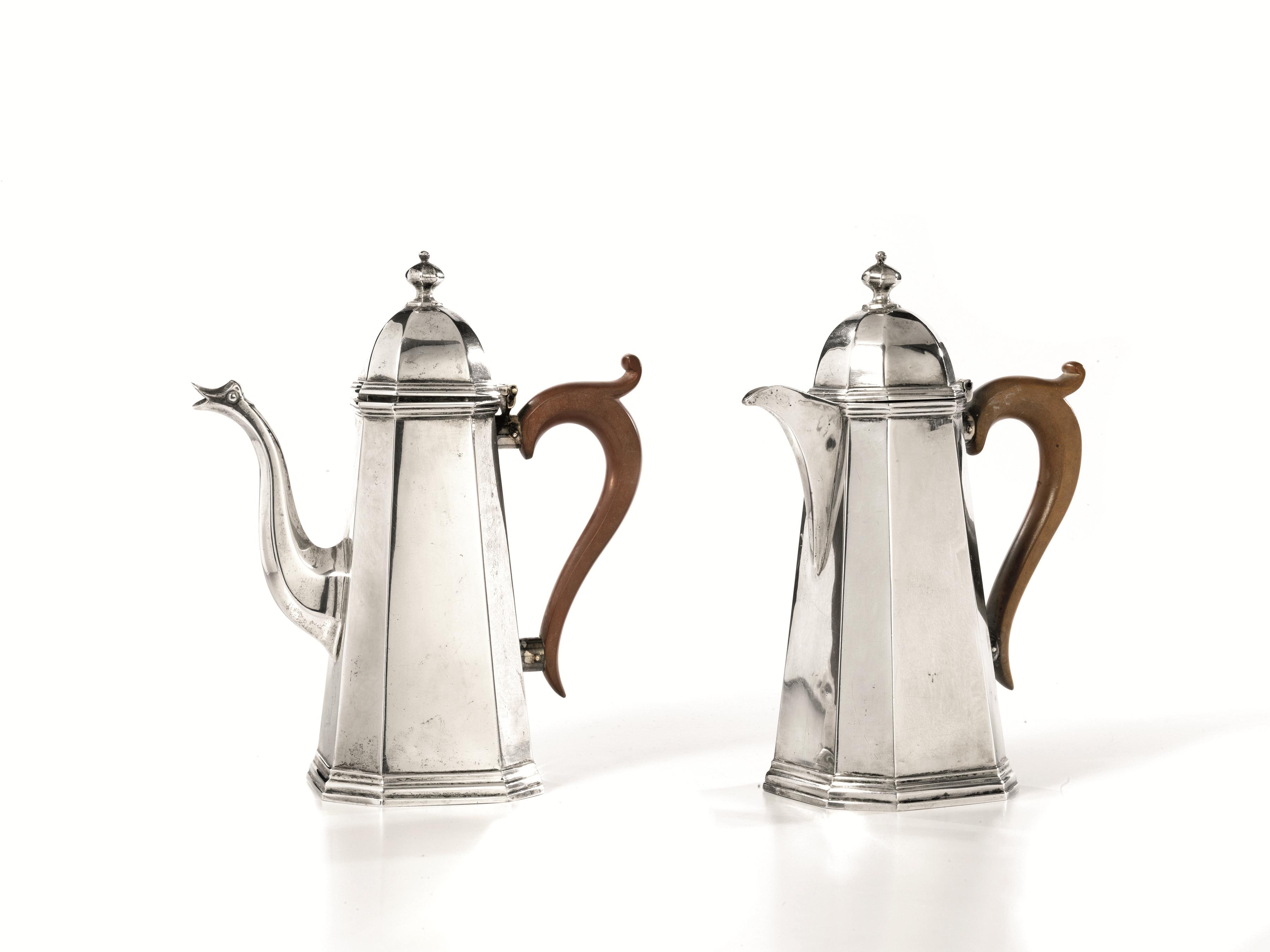 Due caffettiere, Londra, inizi sec. XX, in argento, di forma tronconica, una con becco configurato a cigno, manici a doppia voluta, alt. cm 20, g 820 (2)