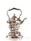 Samovar, in metallo argentato, su base circolare sorretta da quattro piedini a motivi fitomorfi, corpo interamente inciso a tralci vegetali e floreali, sostenuto da sostegni traforati a volute, ampio manico e pesa del coperchio configurata a fiore, alt. cm 36