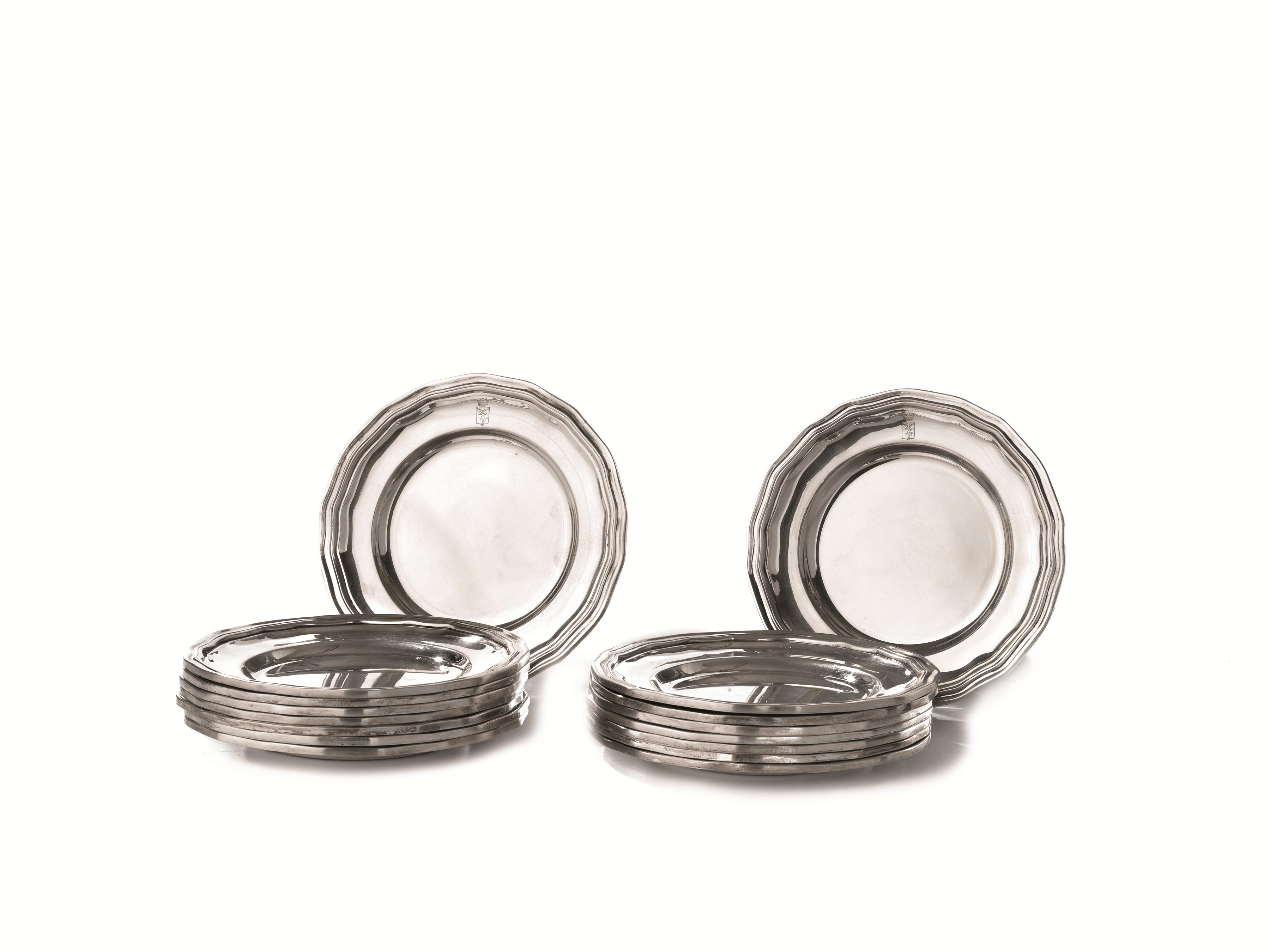 Otto piattini da pane, Miracoli, in argento, en suite con il lotto precedente, diam. cm 12,5, g 1010 e altri otto piattini da pane analoghi, ma privi del punzone dell’argento. Risultano argento alla prova con gli acidi, g 1000 (16)