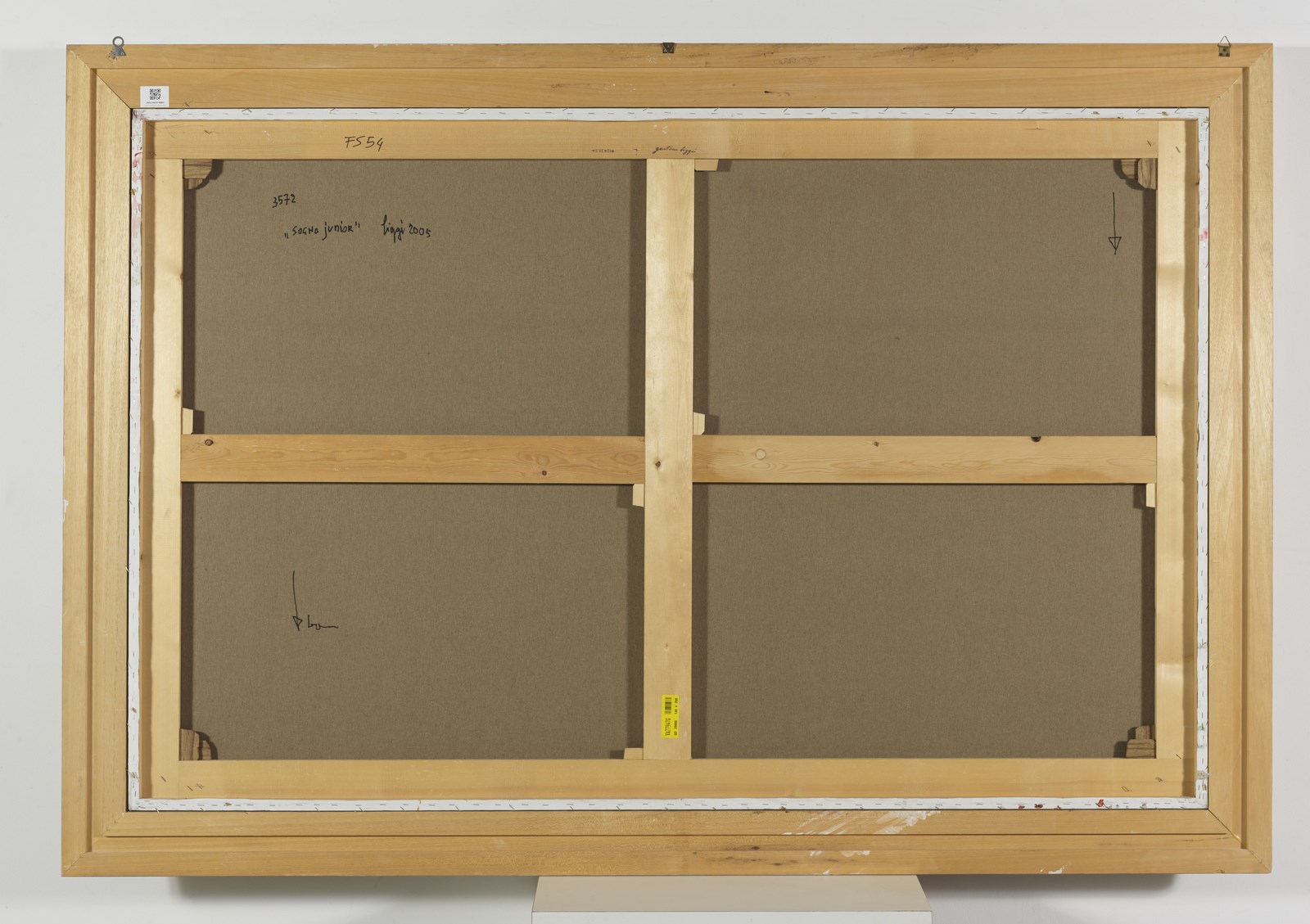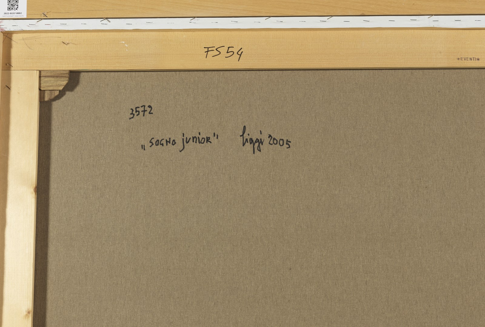 BIGGI GASTONE (1925 - 2014) Sogno junior. 2005. Idropittura su tela. Cm 201,00 x 130,50. Al retro titolo, firma e anno. Autentica dell'artista su fotografia riportante il relativo numero d'inventario e il timbro Art time, Brescia. Lievi difetti. Cornice presente