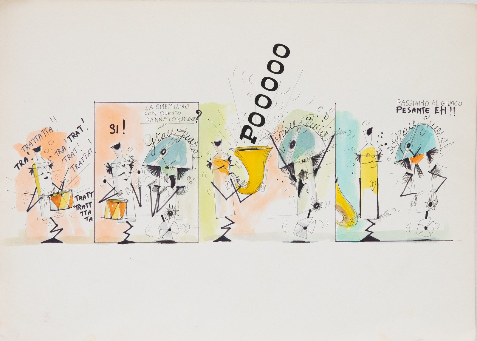 LODOLO FILM Dalla serie sketches dei Posteros. Tecnica mista su cartoncino. Cm 35,00 x 25,00. Il lotto proviene dagli archivi dei collaboratori della Lodolo Film, storica società di spot pubblicitari e di animazione italiana nata verso le fine degli anni 50. I Posteros, personaggi di fantasia, primitivi del futuro, nascono dalla collaborazione di Pino Pascali con la Lodolo film nel1958, un anno prima del suo diploma all’Accademia di Belle Arti di Roma; sodalizio che durò sino al 1967. Sandro Lodolo, titolare della casa di produzione pubblicitaria, e Pino Pascali, nel ruolo di creativo, realizzarono innumerevoli spot e cartoons pubblicitari. Gli Intermezzi che videro proprio i Posteros come protagonisti furono eseguiti , sia in bianco e nero che a colori, nel 1962 e nel 1968, anno della morte di Pascali, quando vennero ripresi da Lodolo come studio per i personaggi di un nuovo contenitore pubblicitario del secondo programma della Rai.