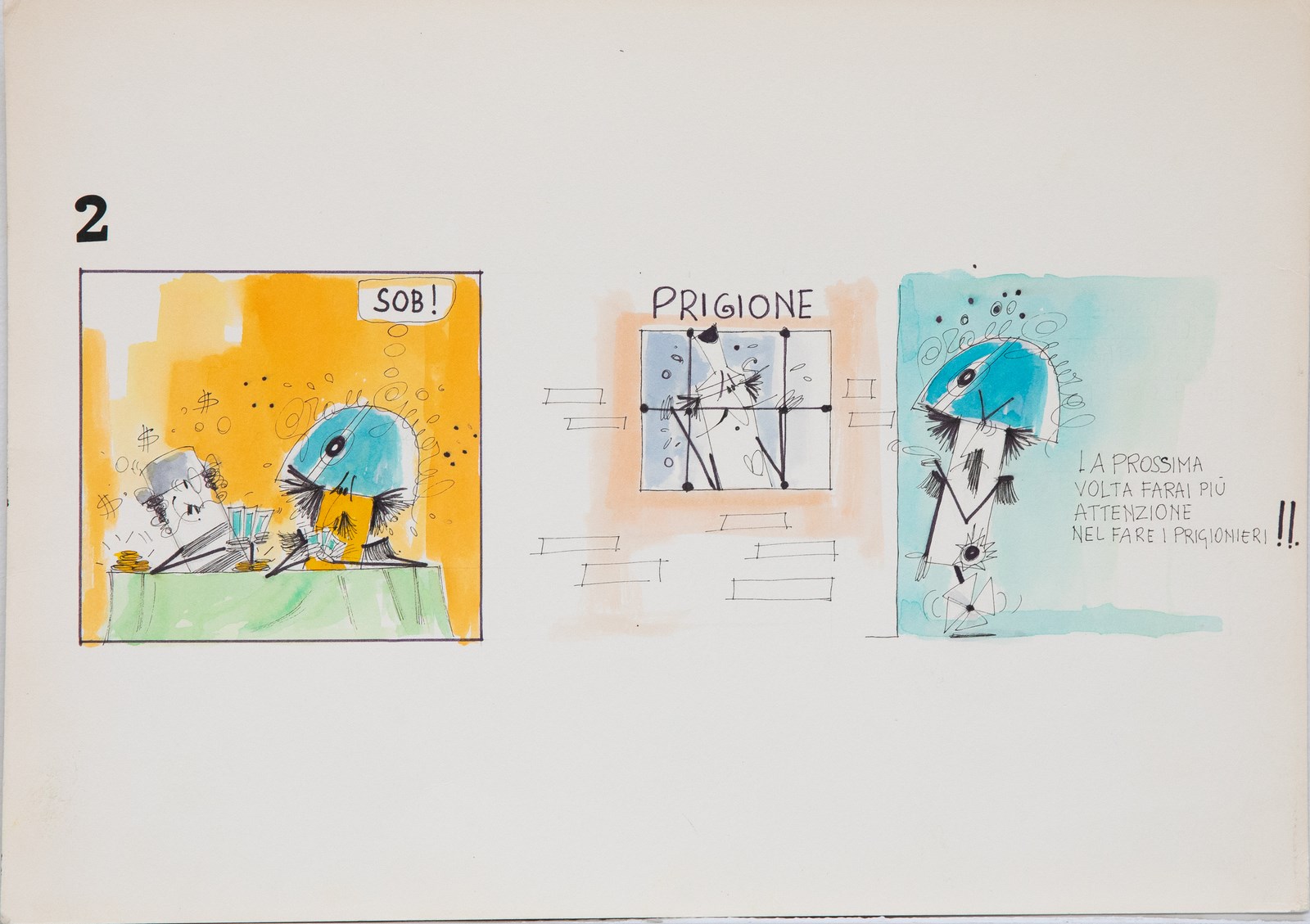 LODOLO FILM Dalla serie sketches dei Posteros. Tecnica mista su cartoncino. Cm 35,00 x 25,00. Il lotto proviene dagli archivi dei collaboratori della Lodolo Film, storica società di spot pubblicitari e di animazione italiana nata verso le fine degli anni 50. I Posteros, personaggi di fantasia, primitivi del futuro, nascono dalla collaborazione di Pino Pascali con la Lodolo film nel1958, un anno prima del suo diploma all’Accademia di Belle Arti di Roma; sodalizio che durò sino al 1967. Sandro Lodolo, titolare della casa di produzione pubblicitaria, e Pino Pascali, nel ruolo di creativo, realizzarono innumerevoli spot e cartoons pubblicitari. Gli Intermezzi che videro proprio i Posteros come protagonisti furono eseguiti , sia in bianco e nero che a colori, nel 1962 e nel 1968, anno della morte di Pascali, quando vennero ripresi da Lodolo come studio per i personaggi di un nuovo contenitore pubblicitario del secondo programma della Rai.
