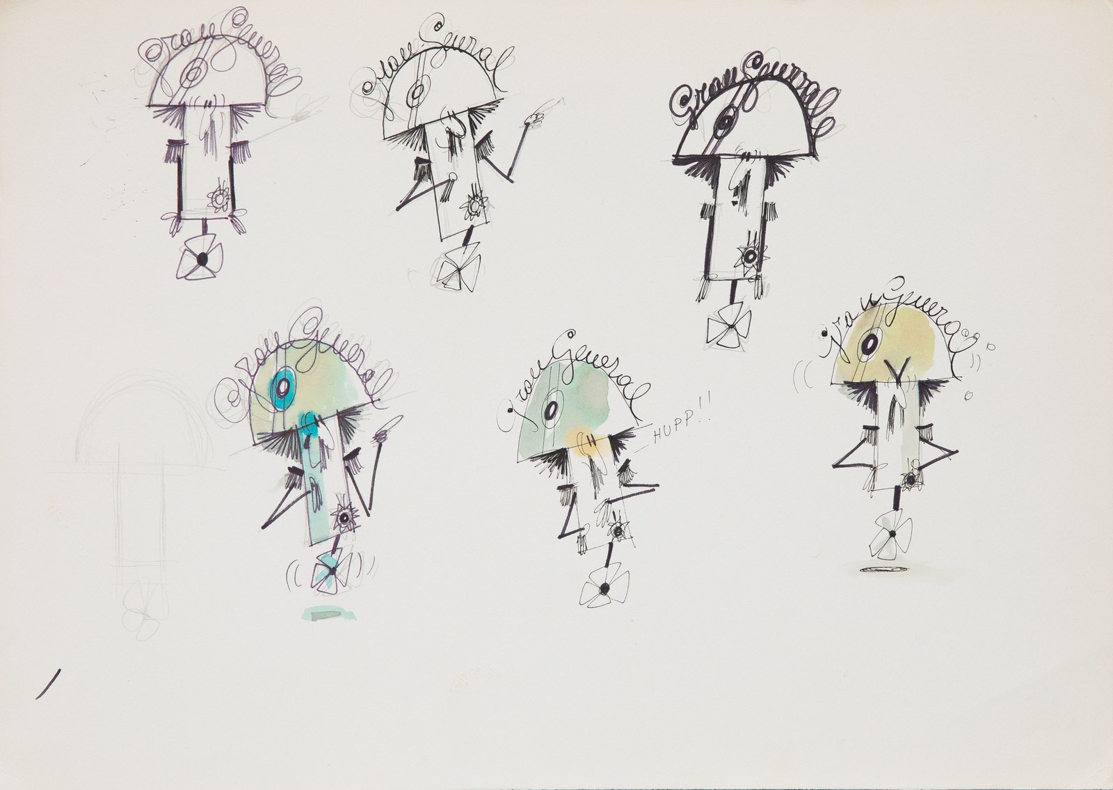 LODOLO FILM Dalla serie sketches dei Posteros. Tecnica mista su cartoncino. Cm 35,00 x 25,00. Il lotto proviene dagli archivi dei collaboratori della Lodolo Film, storica società di spot pubblicitari e di animazione italiana nata verso le fine degli anni 50. I Posteros, personaggi di fantasia, primitivi del futuro, nascono dalla collaborazione di Pino Pascali con la Lodolo film nel1958, un anno prima del suo diploma all’Accademia di Belle Arti di Roma; sodalizio che durò sino al 1967. Sandro Lodolo, titolare della casa di produzione pubblicitaria, e Pino Pascali, nel ruolo di creativo, realizzarono innumerevoli spot e cartoons pubblicitari. Gli Intermezzi che videro proprio i Posteros come protagonisti furono eseguiti , sia in bianco e nero che a colori, nel 1962 e nel 1968, anno della morte di Pascali, quando vennero ripresi da Lodolo come studio per i personaggi di un nuovo contenitore pubblicitario del secondo programma della Rai.