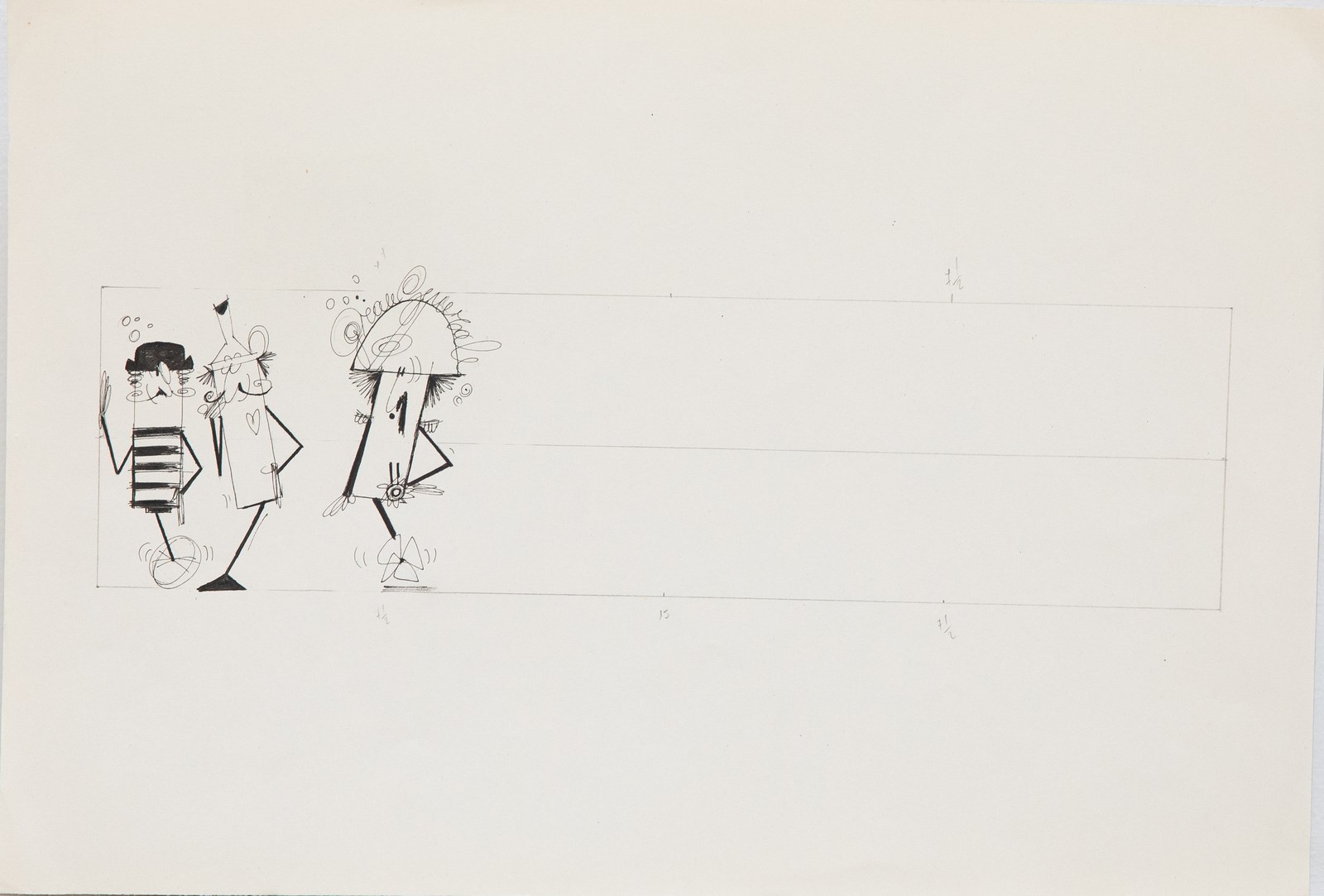 LODOLO FILM Dalla serie sketches dei Posteros. china e grafite su cartoncino. Cm 35,00 x 25,00. Il lotto proviene dagli archivi dei collaboratori della Lodolo Film, storica società di spot pubblicitari e di animazione italiana nata verso le fine degli anni 50. I Posteros, personaggi di fantasia, primitivi del futuro, nascono dalla collaborazione di Pino Pascali con la Lodolo film nel1958, un anno prima del suo diploma all’Accademia di Belle Arti di Roma; sodalizio che durò sino al 1967. Sandro Lodolo, titolare della casa di produzione pubblicitaria, e Pino Pascali, nel ruolo di creativo, realizzarono innumerevoli spot e cartoons pubblicitari. Gli Intermezzi che videro proprio i Posteros come protagonisti furono eseguiti , sia in bianco e nero che a colori, nel 1962 e nel 1968, anno della morte di Pascali, quando vennero ripresi da Lodolo come studio per i personaggi di un nuovo contenitore pubblicitario del secondo programma della Rai.